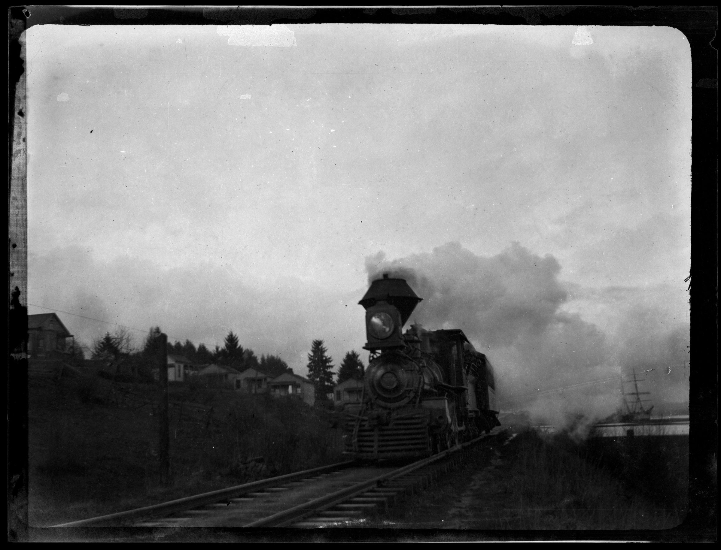 Negative, sheet film. 3 x 4 b&w. Locomotive on Port Townsend Southern tracks near brewery.