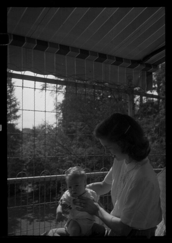 Negative, sheet film. 1 x 1.5 b&w. Elva Schmidt (wife of Peter G. Schmidt Jr.) with daughter Mimi.
