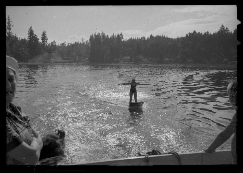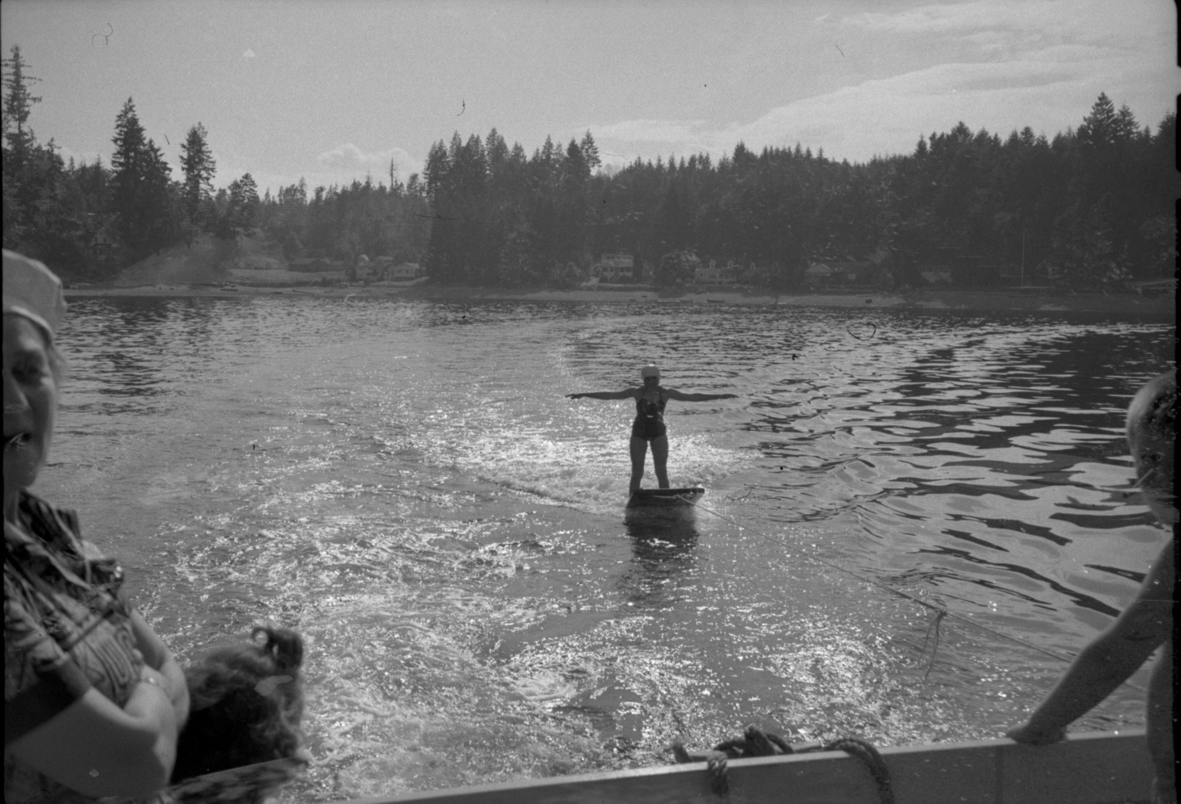 Negative, sheet film. 1 x 1.5 b&w. Clara Schmidt at left, no ID on others. Girl being towed by boat.