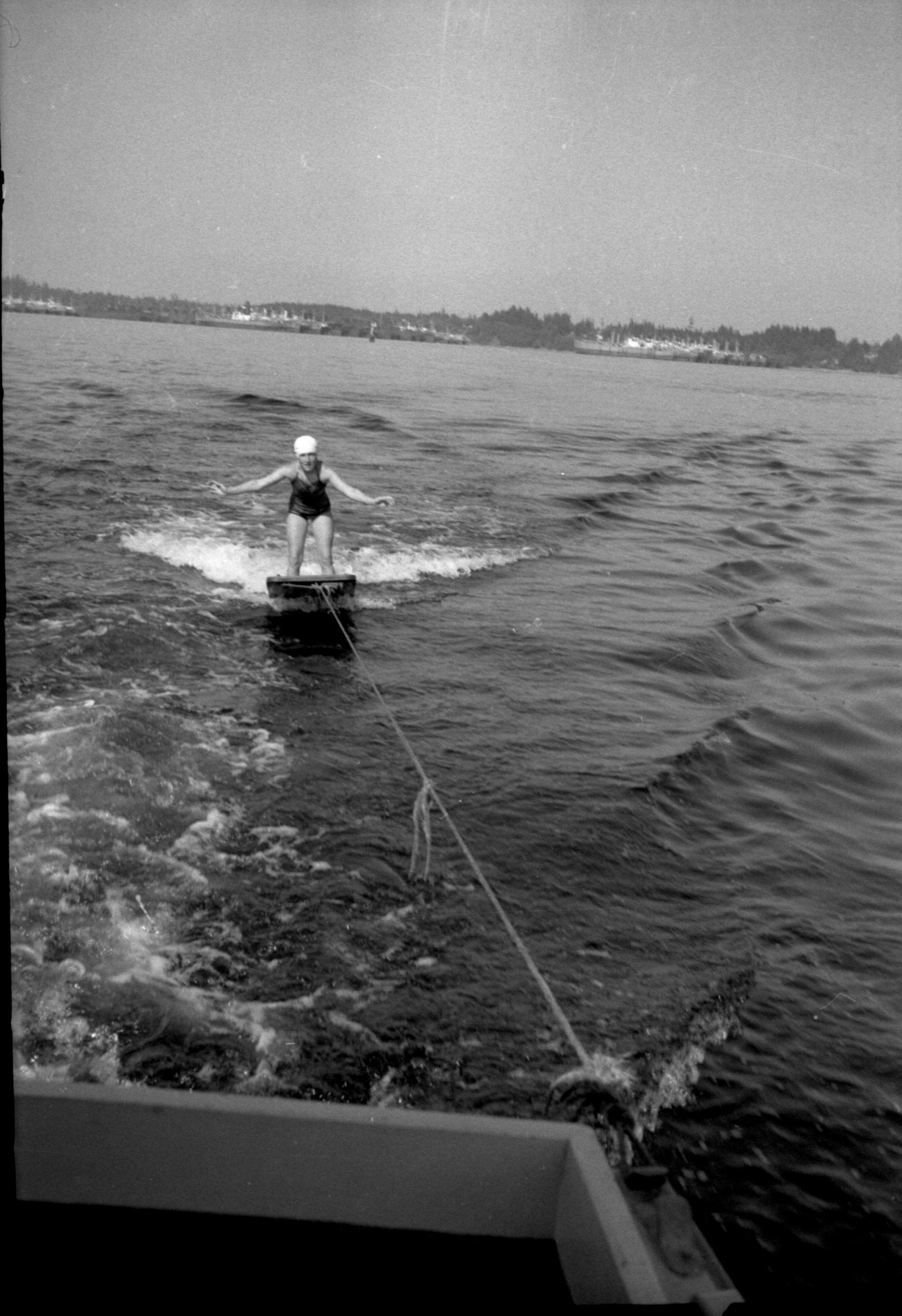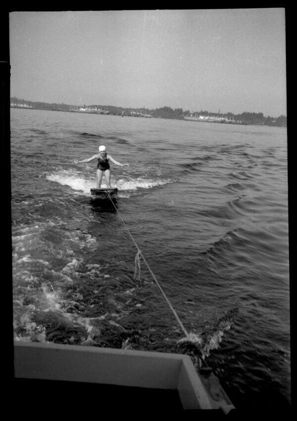 Negative, sheet film. 1 x 1.5 b&w. Girl being towed by boat. No ID.