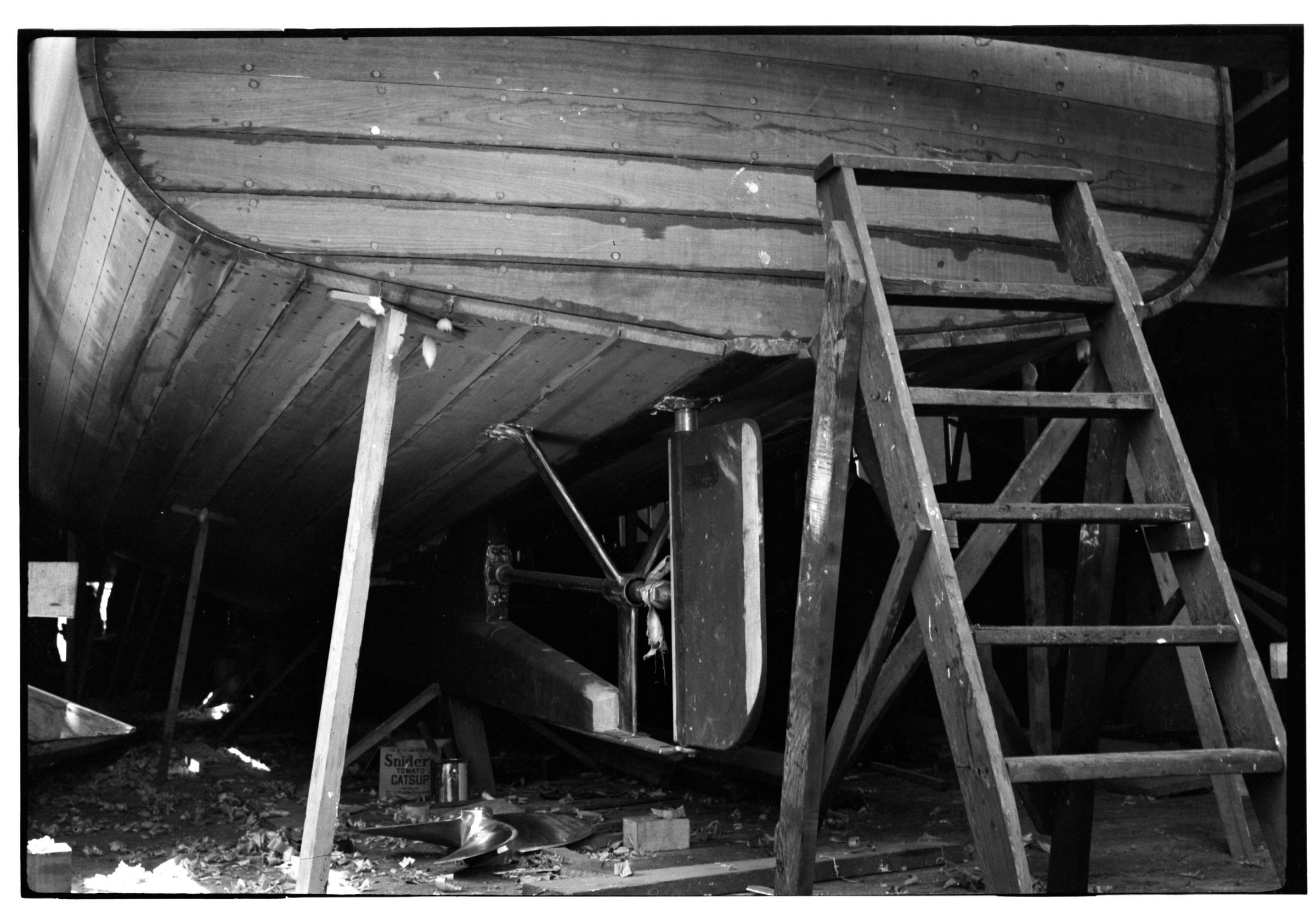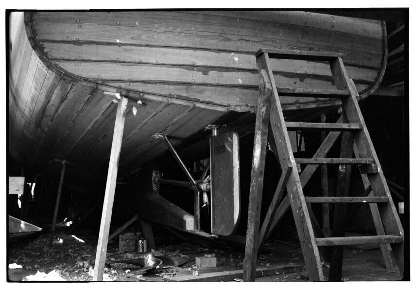 Negative, sheet film. 2 x 3 b&w. Boat undergoing maintenance in unidentified boatyard.