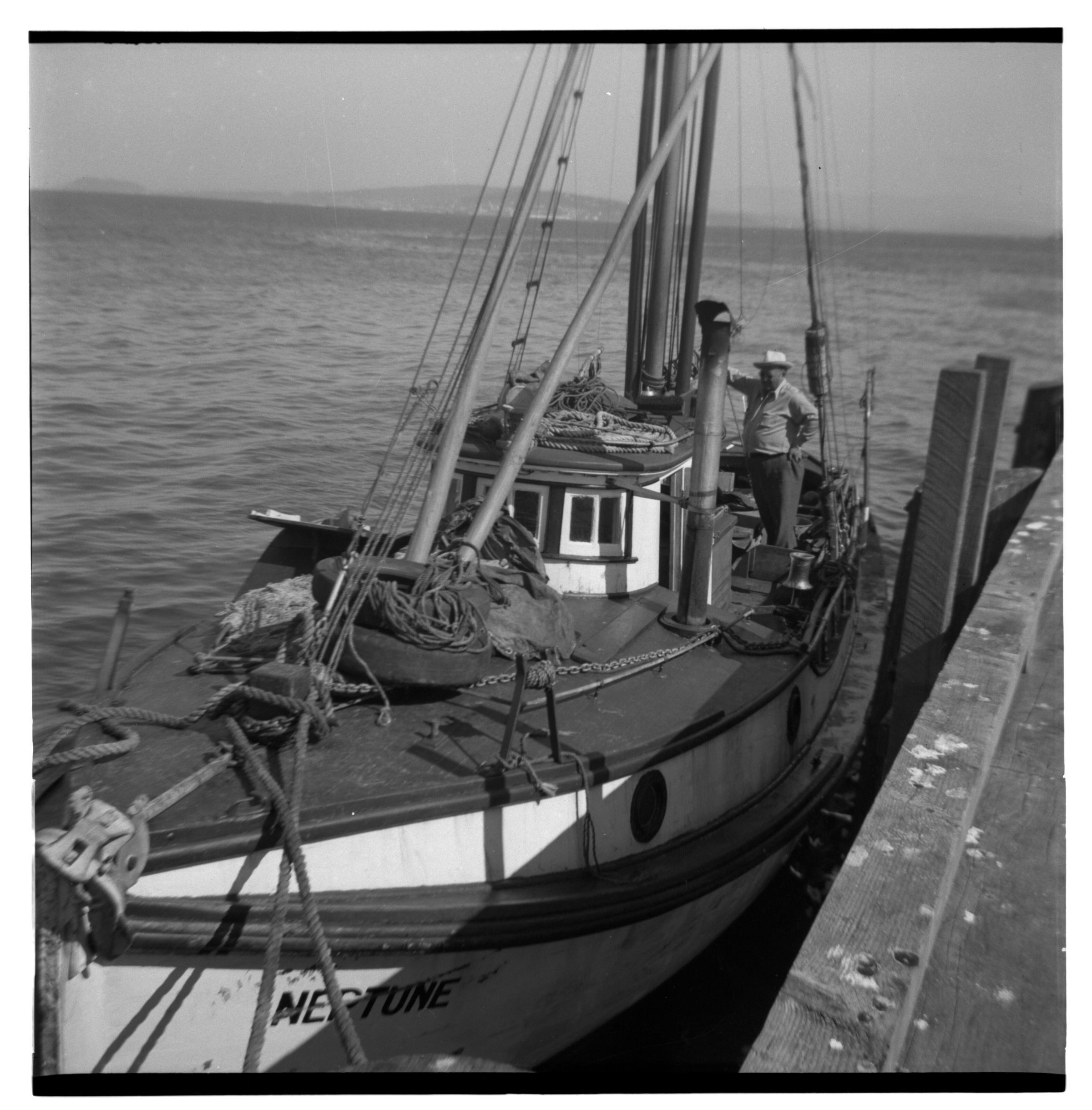 Negative, sheet film. 2.25 x 2.25 b&w. Columbia River fishing trip, Astoria Derby. Dr. Dammasch, Dr. Emge, Carl Wagner, and Peter G. Schmidt Sr. took photographs. No ID on man. Boat is Neptune.