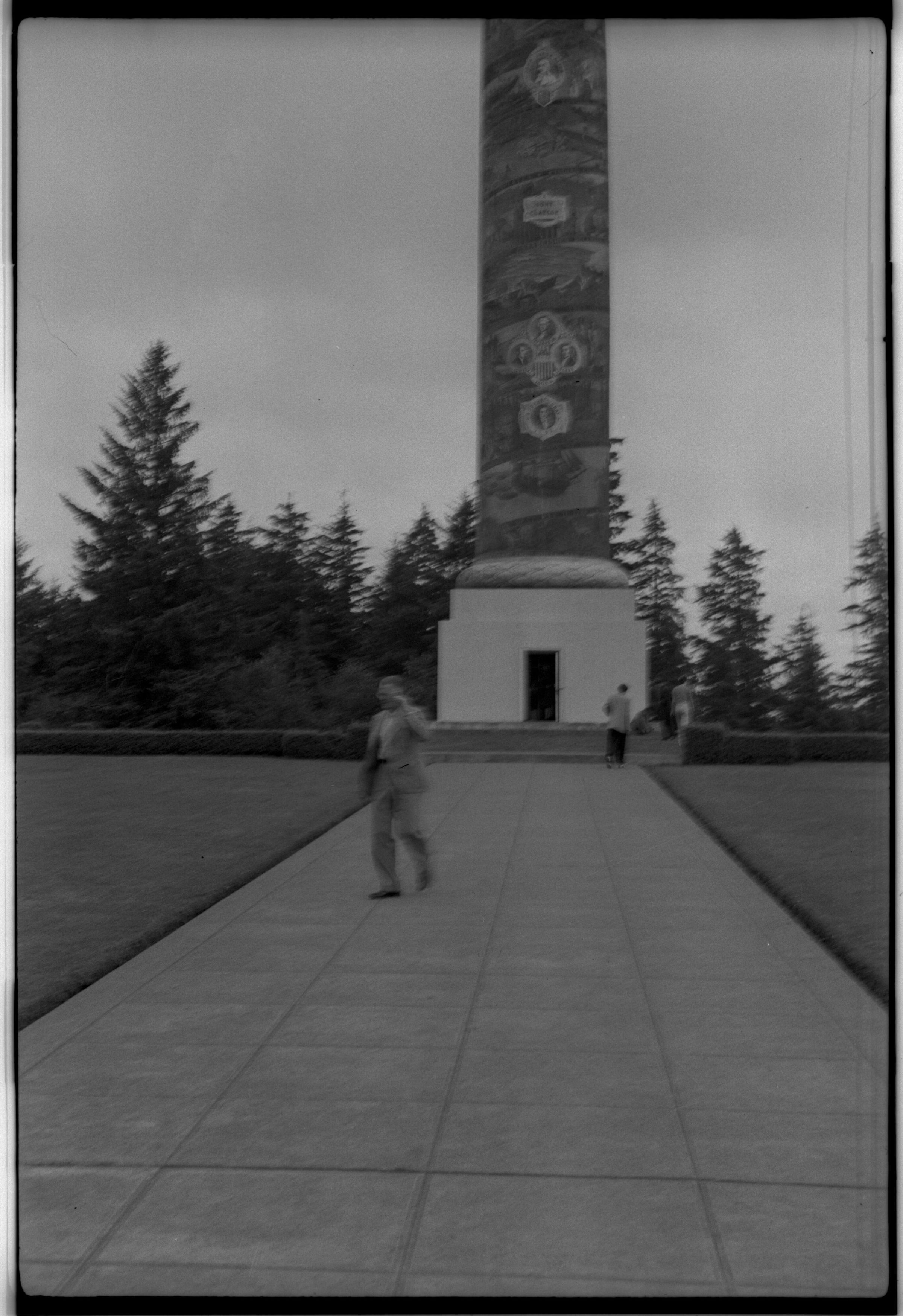 Negative, sheet film. 3 x 2 b&w. Astoria Column, OR. No ID on people.