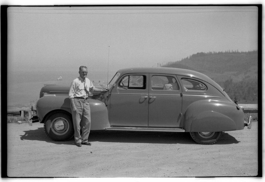 Negative, sheet film. 3 x 2 b&w. Peter G. Schmidt Sr. in front of car at scenic overlook, probably along Columbia River.