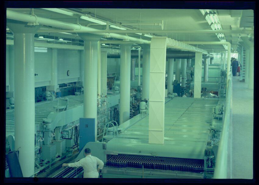 Negative, sheet film. 2 x 3 color. A bottlehouse interior at Olympia brewery, showing tall pasteurizers.