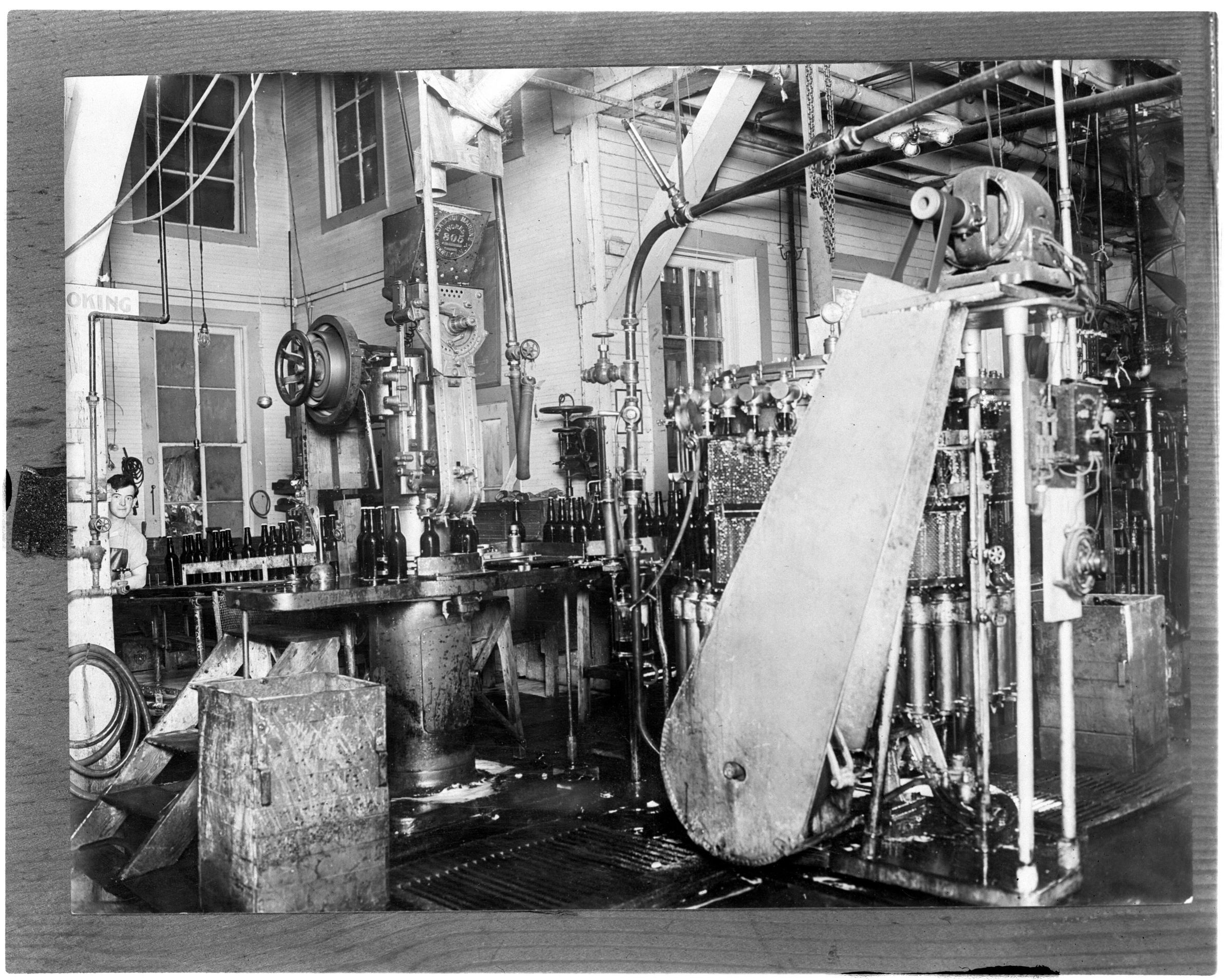 Negative, sheet film. 4 x 5 b&w. Filler machine on right, capper on left. Machines are powered by electricity, rather than drawing from gas producer.