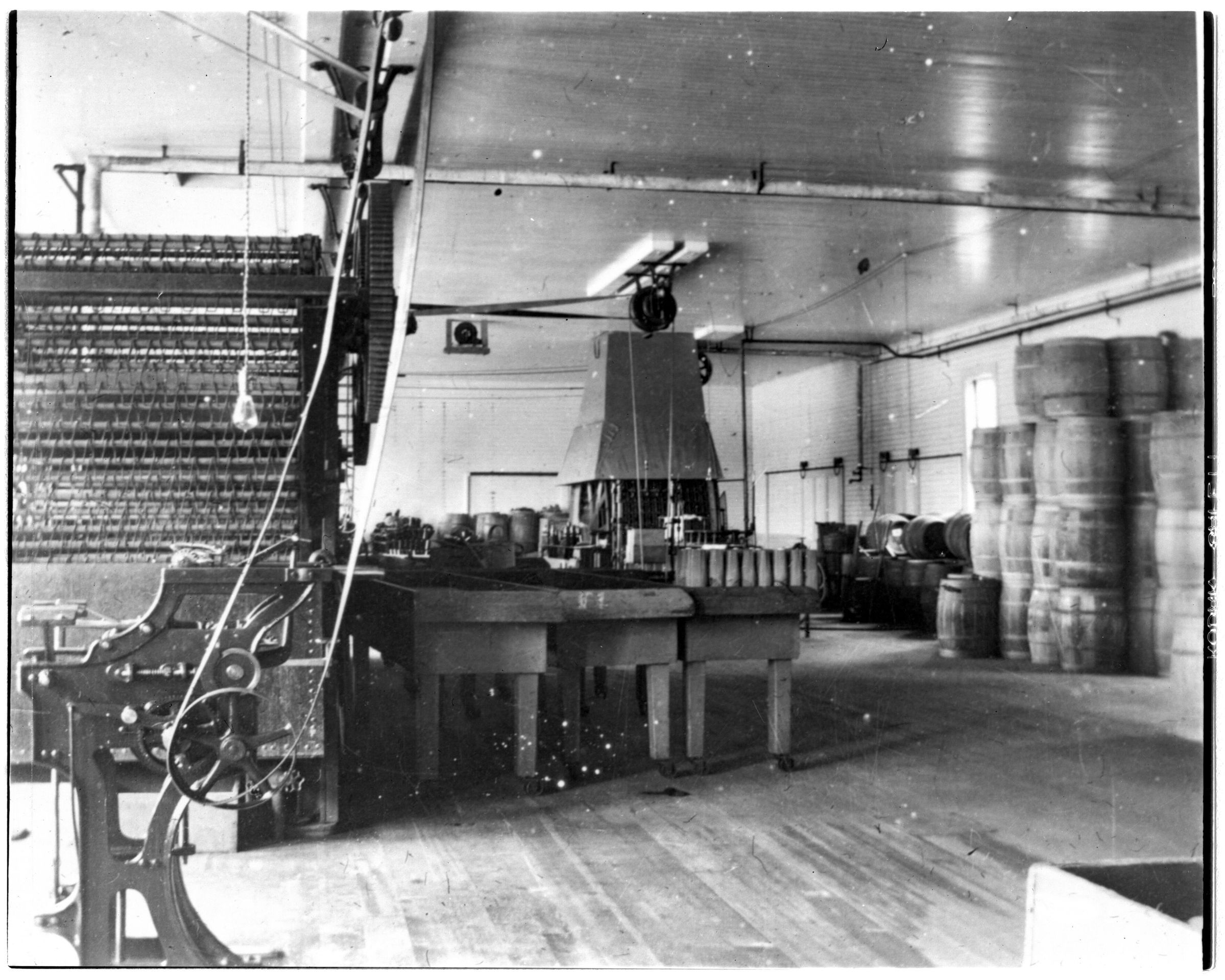 Negative, sheet film. 4 x 5 b&w. Machinery on left is a bottle washer. On right is a stack of wooden barrels (not kegs) used for shipping bottled beer.