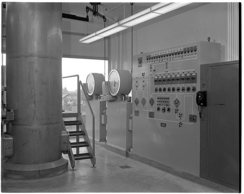 Negative, sheet film. 4 x 5 b&w. Oly Brewery showing scales, one for malt and one for cereal, in B brewhouse. Control panel on right. Large column at left is stack coming up from brew kettle on lower floor.Name/Title