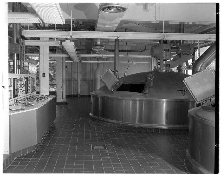 Negative, sheet film. 4 x 5 b&w. OBCo. Mash tub in background, cooker in right foreground, control panel at left, in B brewhouse. Taken for B. Holmes.