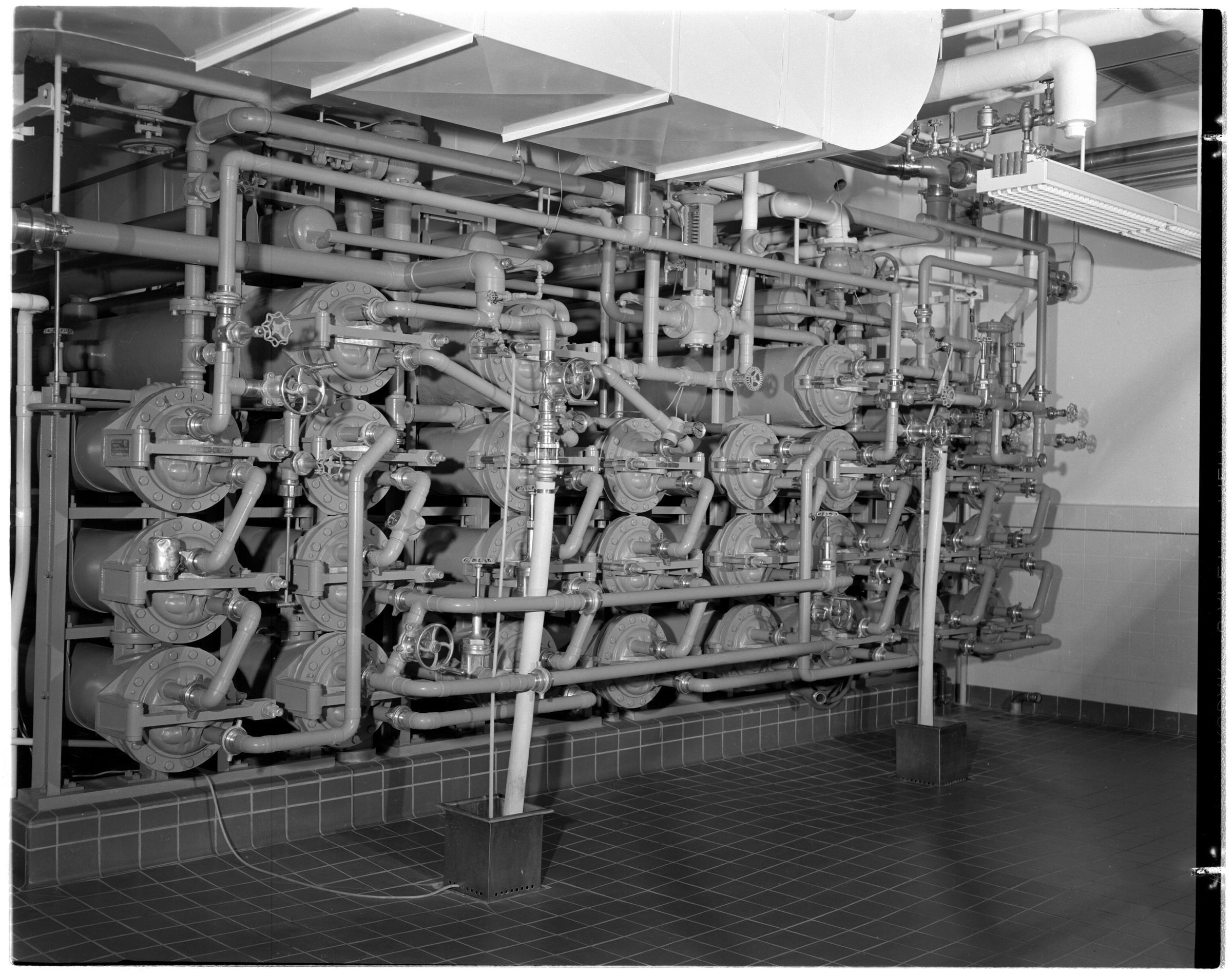 Negative, sheet film. 4 x 5 b&w. OBCo. Tube and shell wort cooler in A brewhouse. Taken for B. Holmes.