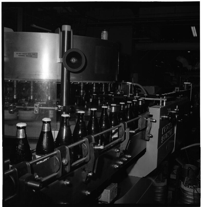 Negative, sheet film. 2.25 x 2.25 b&w. Beer bottles and labeler at Oly brewery.