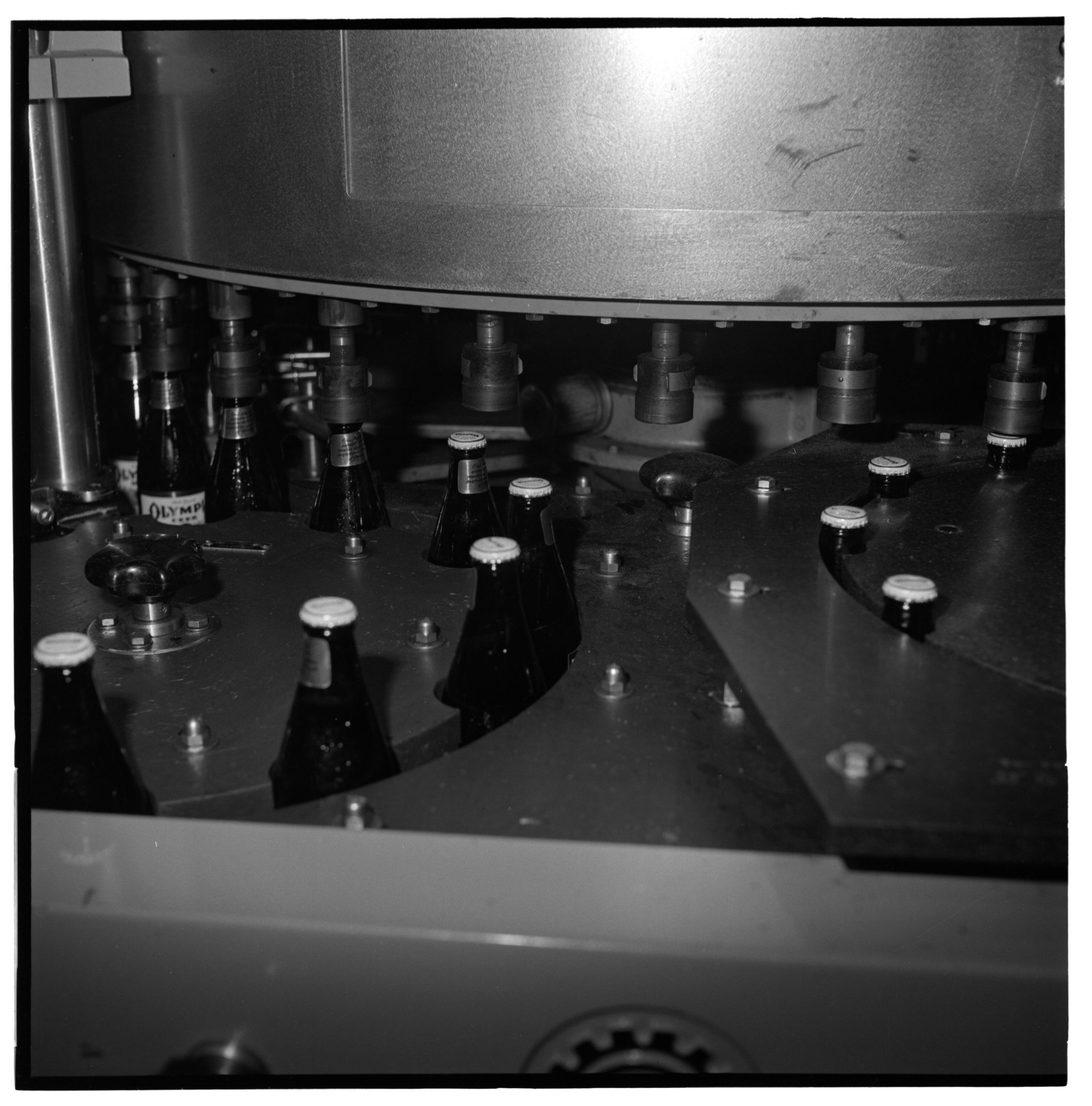 Negative, sheet film. 2.25 x 2.25 b&w. Beer bottles and labeler at Oly brewery.