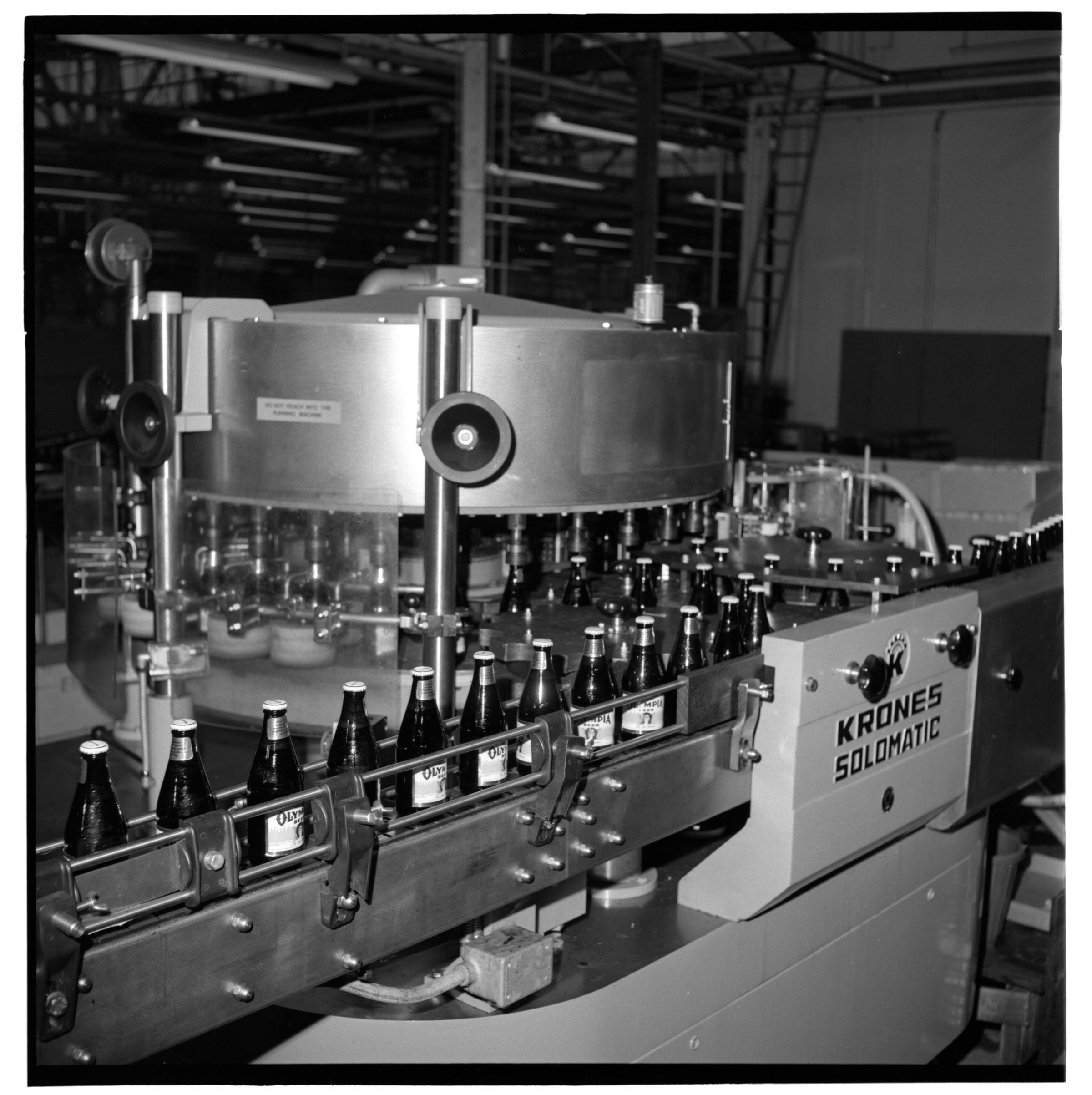 Negative, sheet film. 2.25 x 2.25 b&w. Beer bottles and labeler at Oly brewery.