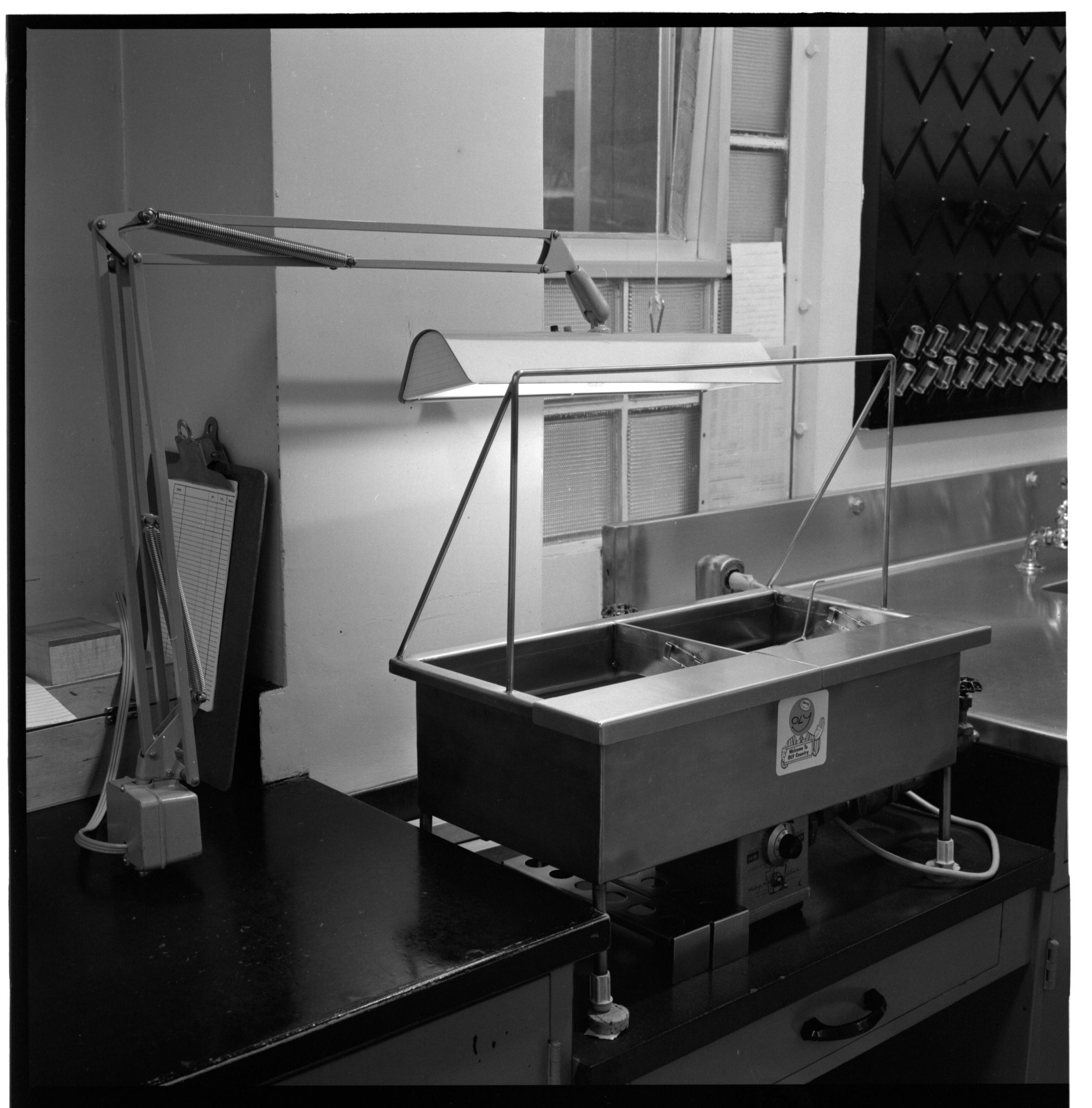 Negative, sheet film. 2.25 x 2.25 b&w. Magnetic stirring equipment (MagneStir) used to prepare beer samples for analysis (temperating?) at Olympia brewery lab.