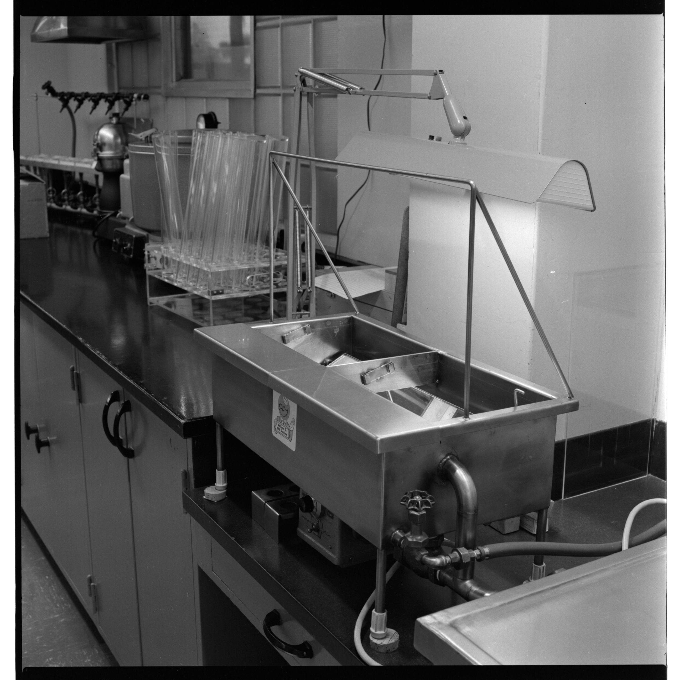 Negative, sheet film. 2.25 x 2.25 b&w. Magnetic stirring equipment (MagneStir) used to prepare beer samples for analysis (temperating?) at Olympia brewery lab.