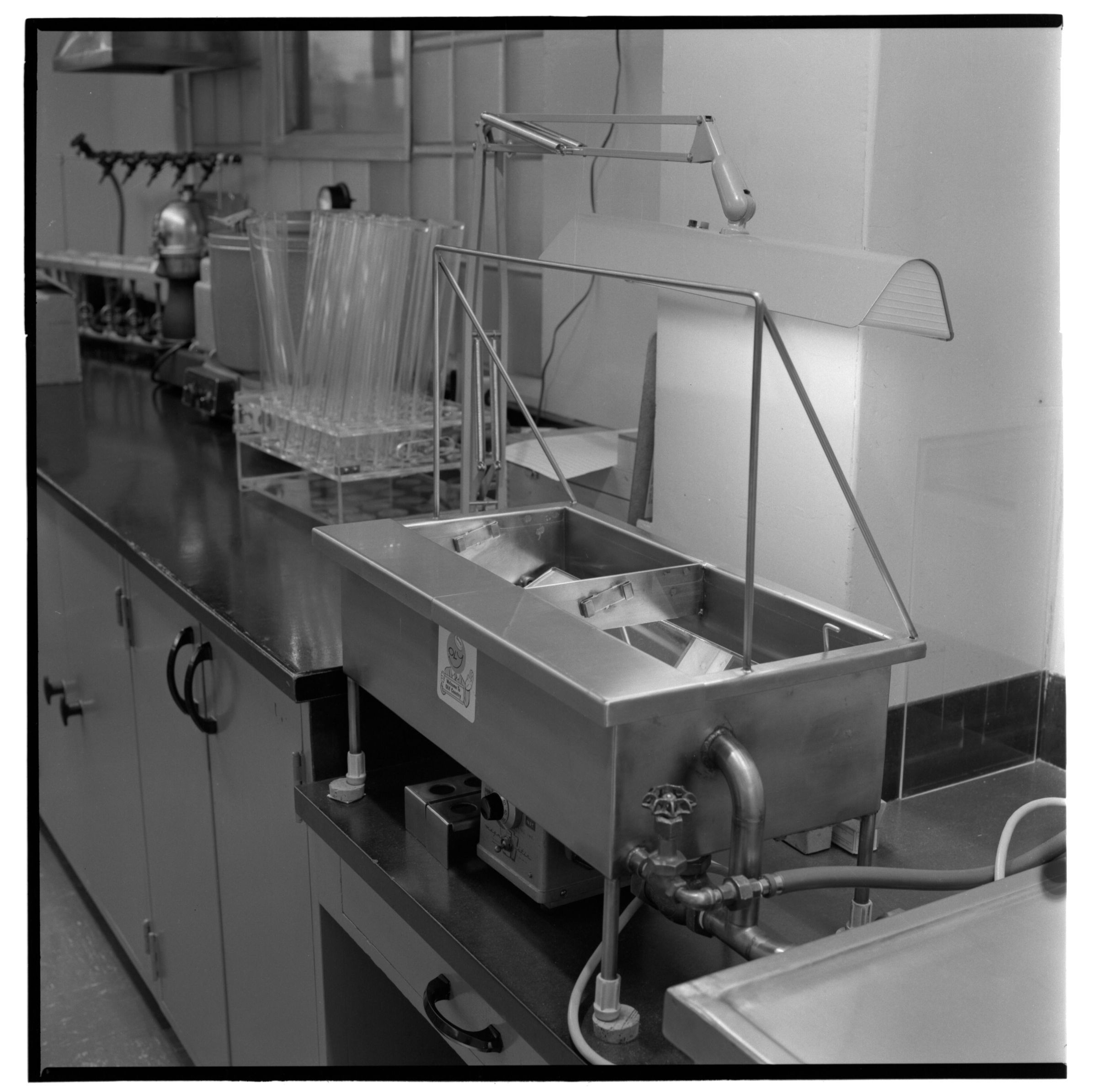 Negative, sheet film. 2.25 x 2.25 b&w. Magnetic stirring equipment (MagneStir) used to prepare beer samples for analysis (temperating?) at Olympia brewery lab.