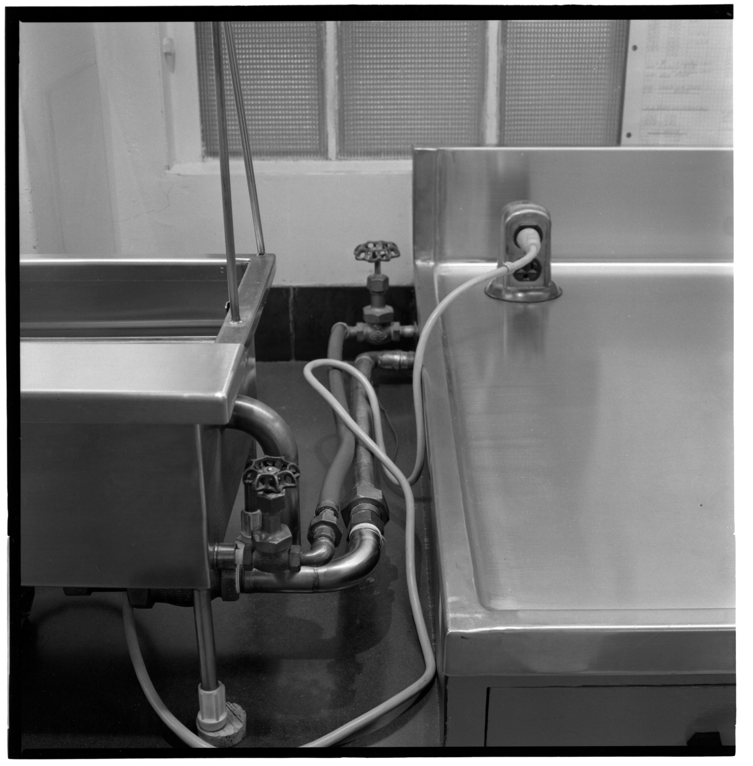 Negative, sheet film. 2.25 x 2.25 b&w. Magnetic stirring equipment (MagneStir) used to prepare beer samples for analysis (temperating?) at Olympia brewery lab.