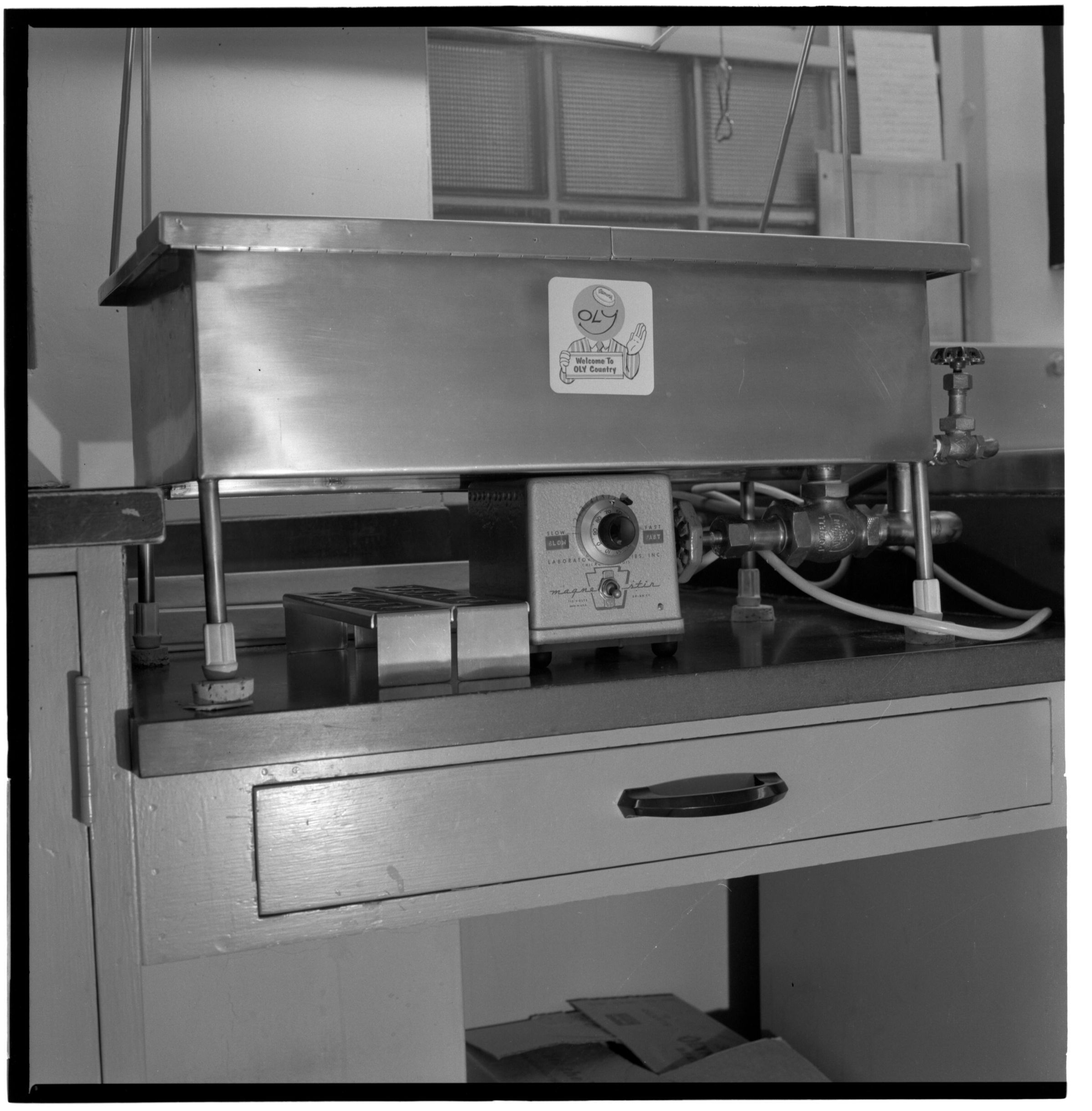 Negative, sheet film. 2.25 x 2.25 b&w. Magnetic stirring equipment (MagneStir) used to prepare beer samples for analysis (temperating?) at Olympia brewery lab.