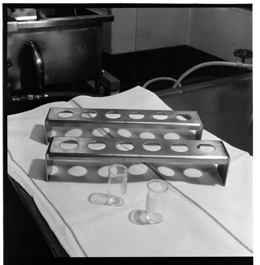 Negative, sheet film. 2.25 x 2.25 b&w. Magnetic stirring equipment (MagneStir) used to prepare beer samples for analysis (temperating?) at Olympia brewery lab. Beakers and beaker holders shown.