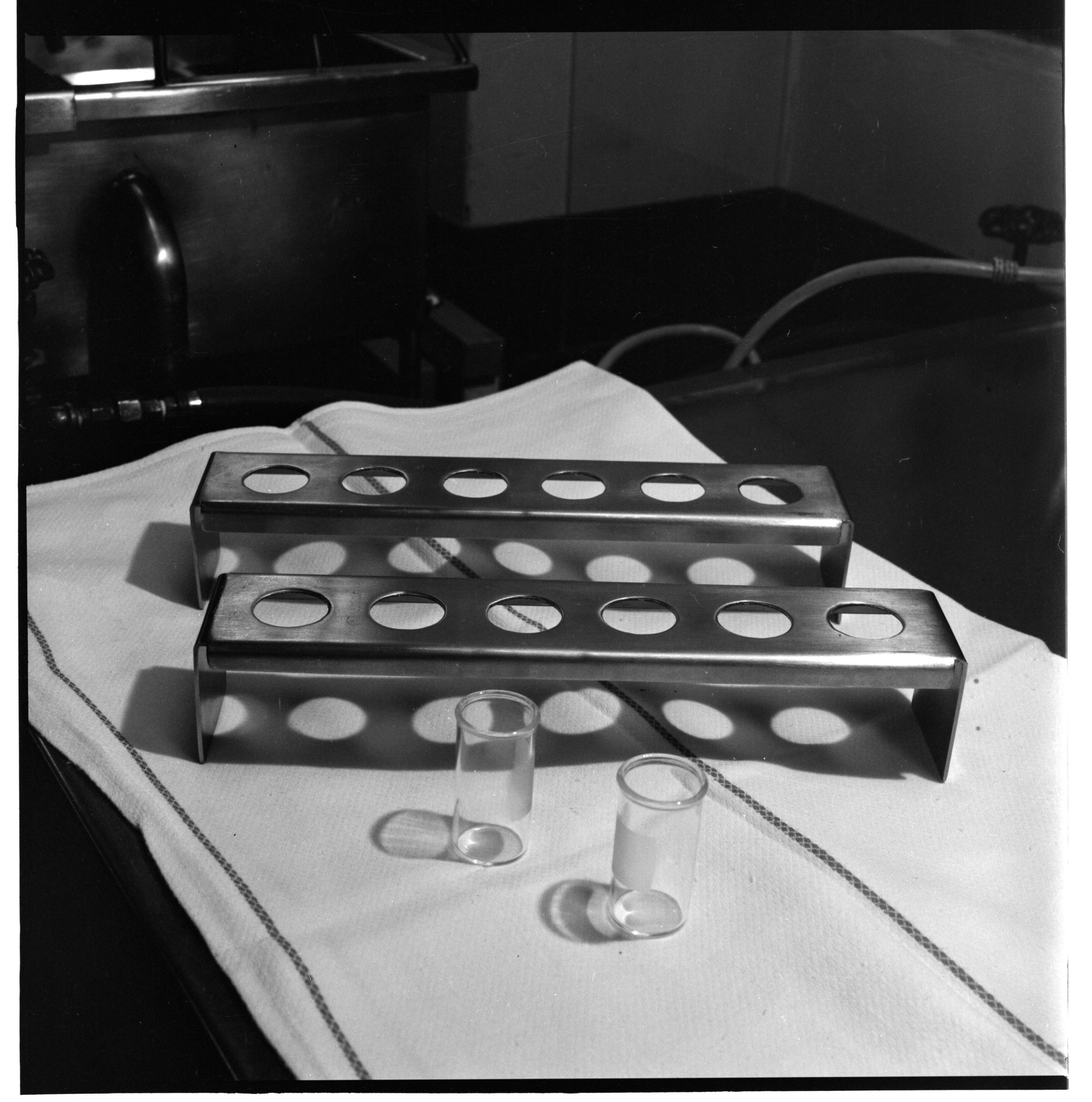 Negative, sheet film. 2.25 x 2.25 b&w. Magnetic stirring equipment (MagneStir) used to prepare beer samples for analysis (temperating?) at Olympia brewery lab. Beakers and beaker holders shown.