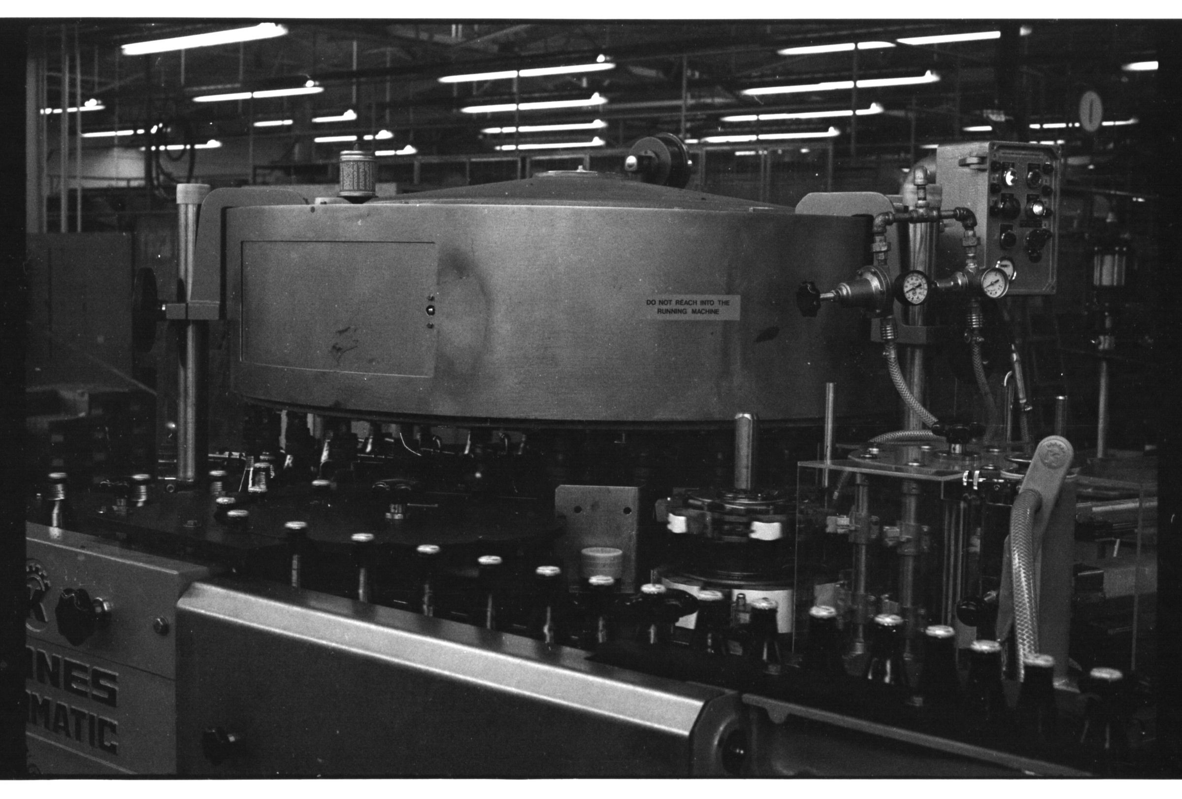 Negative, sheet film. 1 x 1.5 b&w. Beer bottles and labeler at Oly brewery.