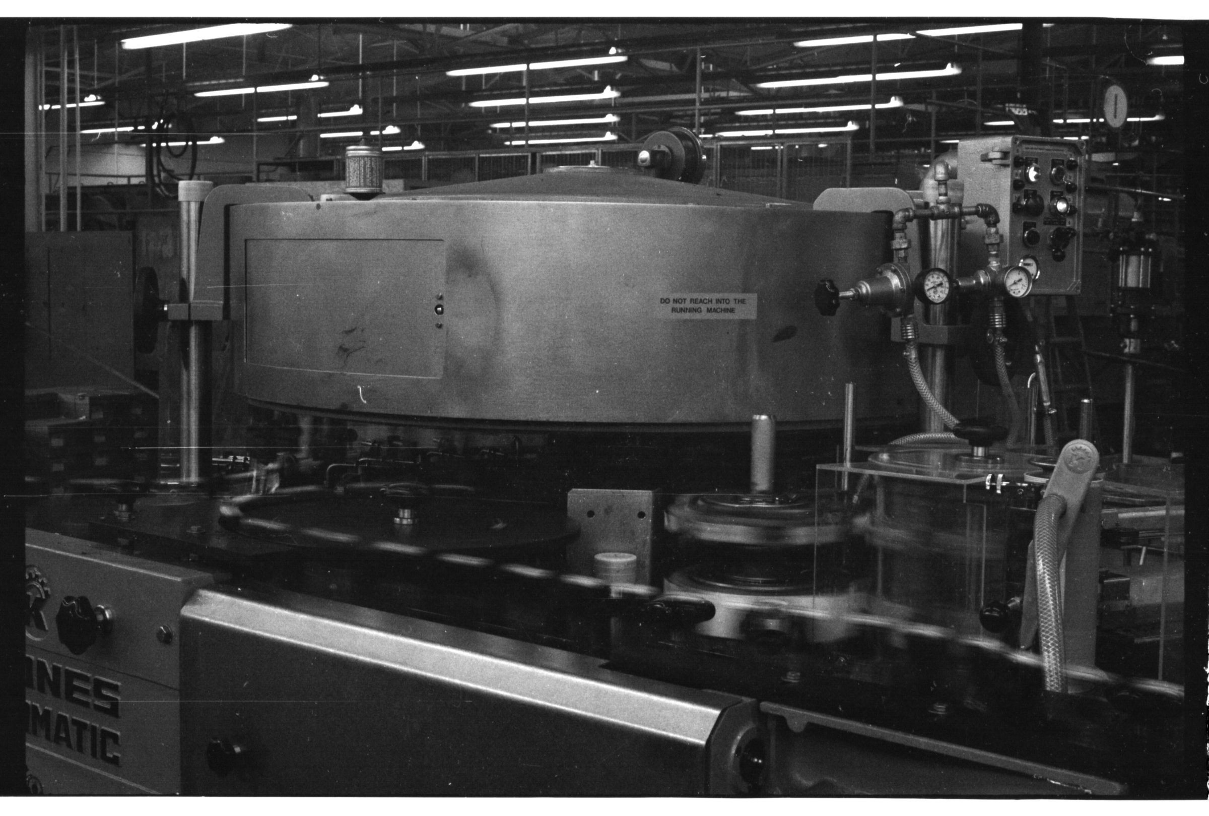 Negative, sheet film. 1 x 1.5 b&w. Beer bottles and labeler at Oly brewery.