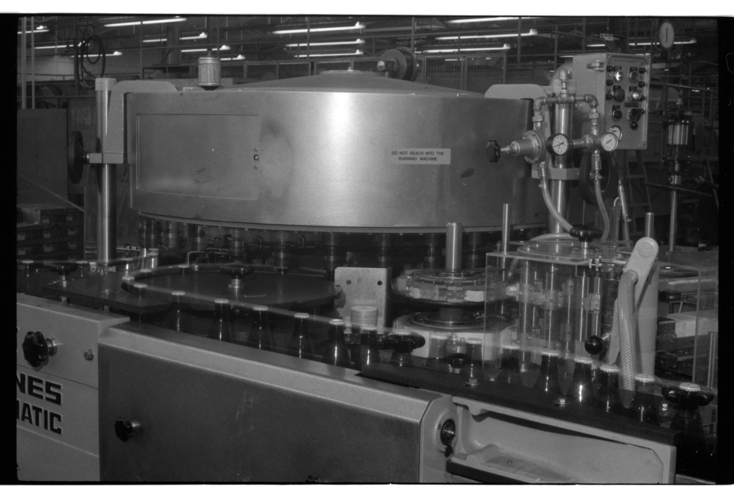 Negative, sheet film. 1 x 1.5 b&w. Beer bottles and labeler at Oly brewery.
