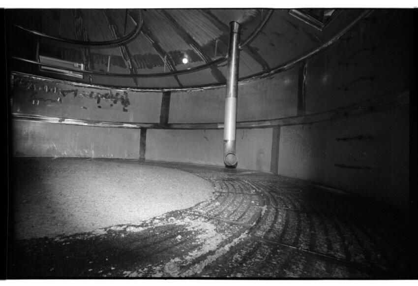 Negative, sheet film. 1 x 1.5 b&w. Unidentified pipe in a brewing vessel at Oly brewery.