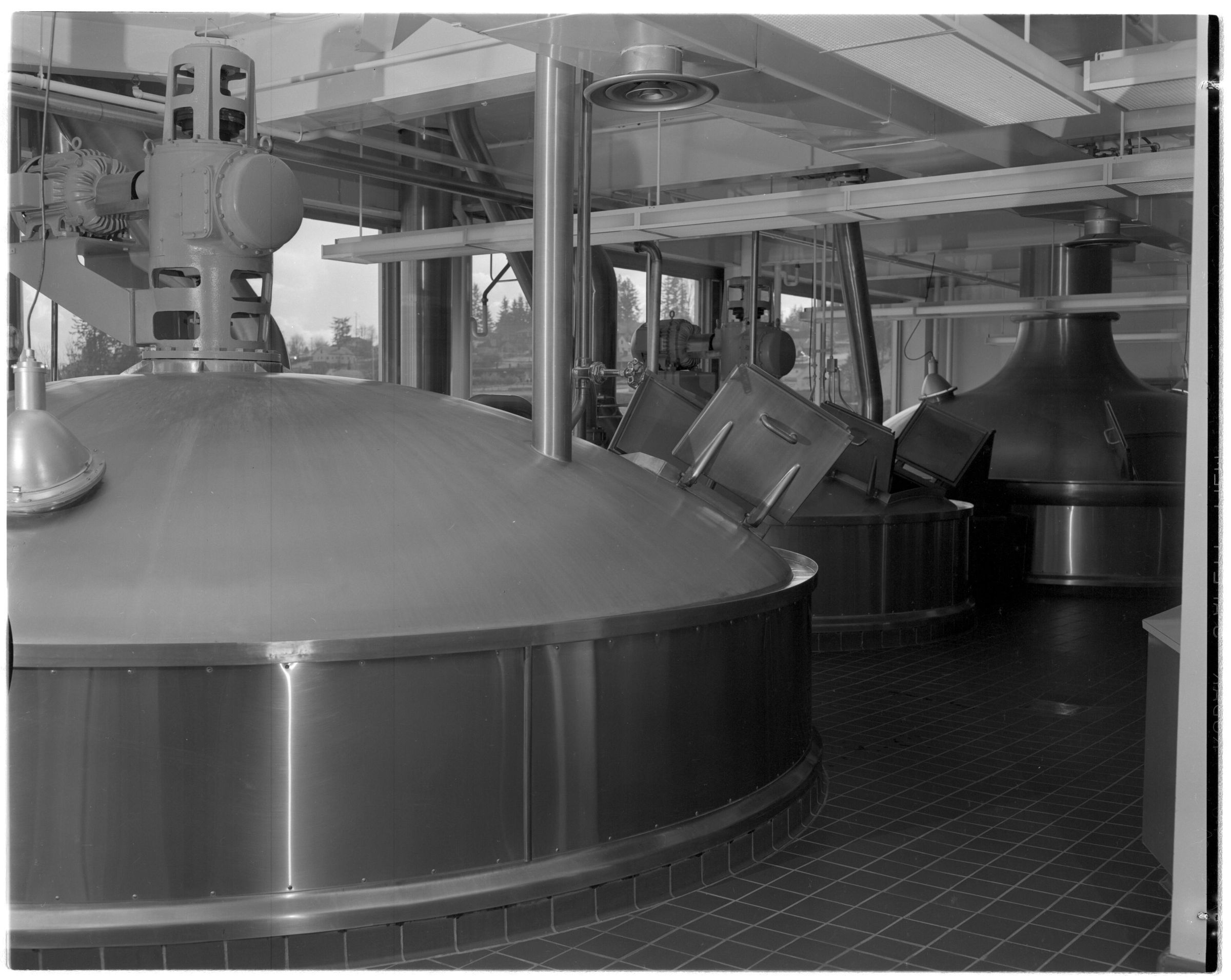 Negative, sheet film. 4 x 5 b&w. B brewhouse at Oly brewery, brew kettle in background. Mash cooker in foreground.