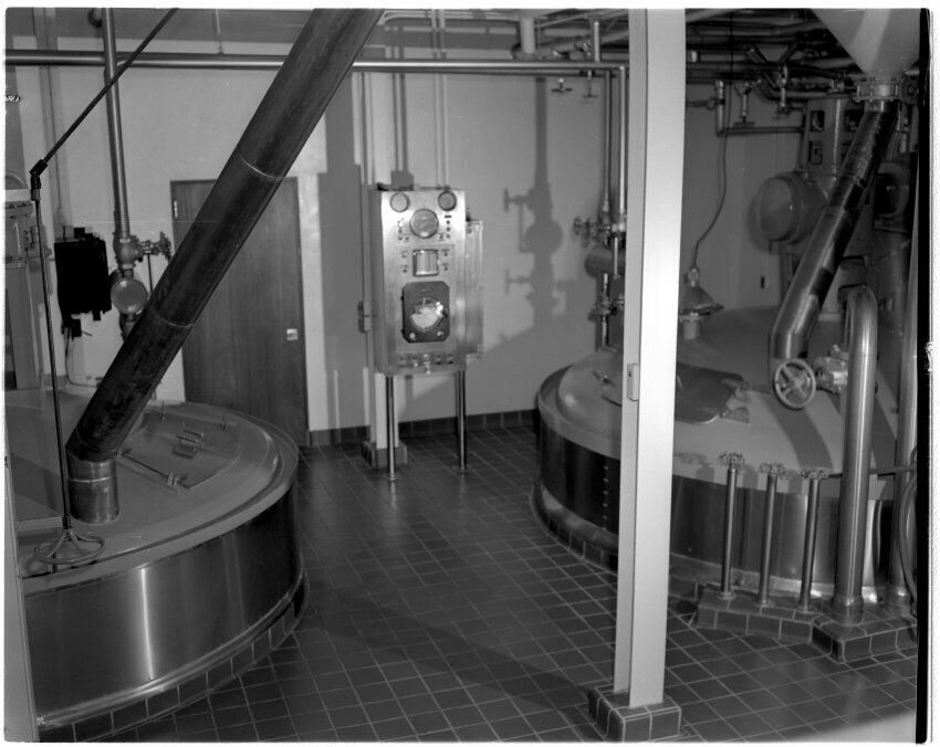 Negative, sheet film. 4 x 5 b&w. Brewing floor in A brewhouse at Oly brewery. #3 lauter tub on right, and #3 kettle on left.