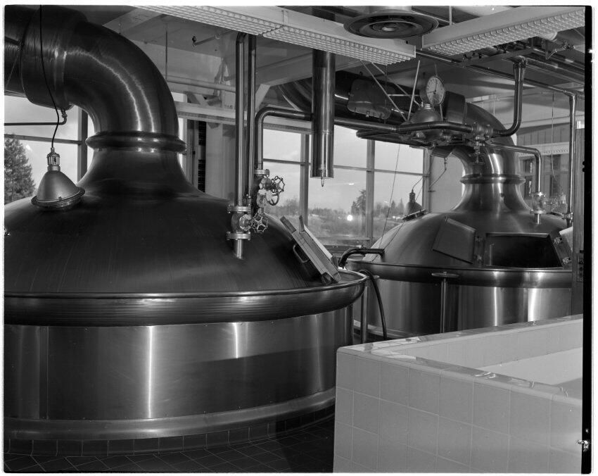 Negative, sheet film. 4 x 5 b&w. #5 brew kettle on right at Oly brewery. Mash tun on left. View looking west.