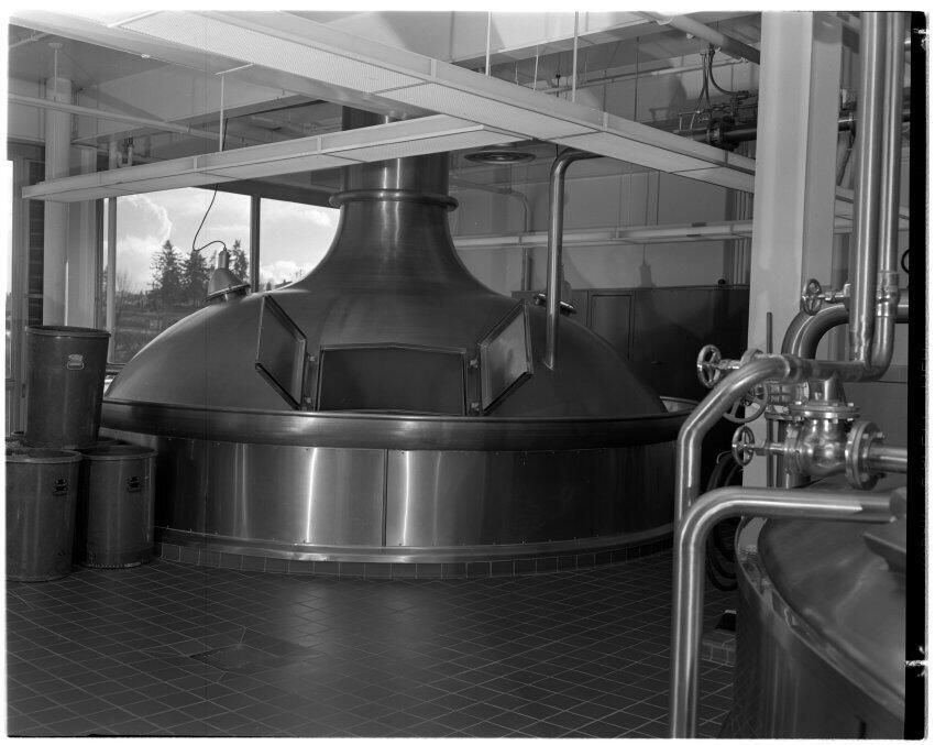 Negative, sheet film. 4 x 5 b&w. #6 brew kettle at Oly brewery. Fiber resin hop buckets are stacked to the left of the brew kettle. On right is the mash tub. View looking east.Other Names and Numbers