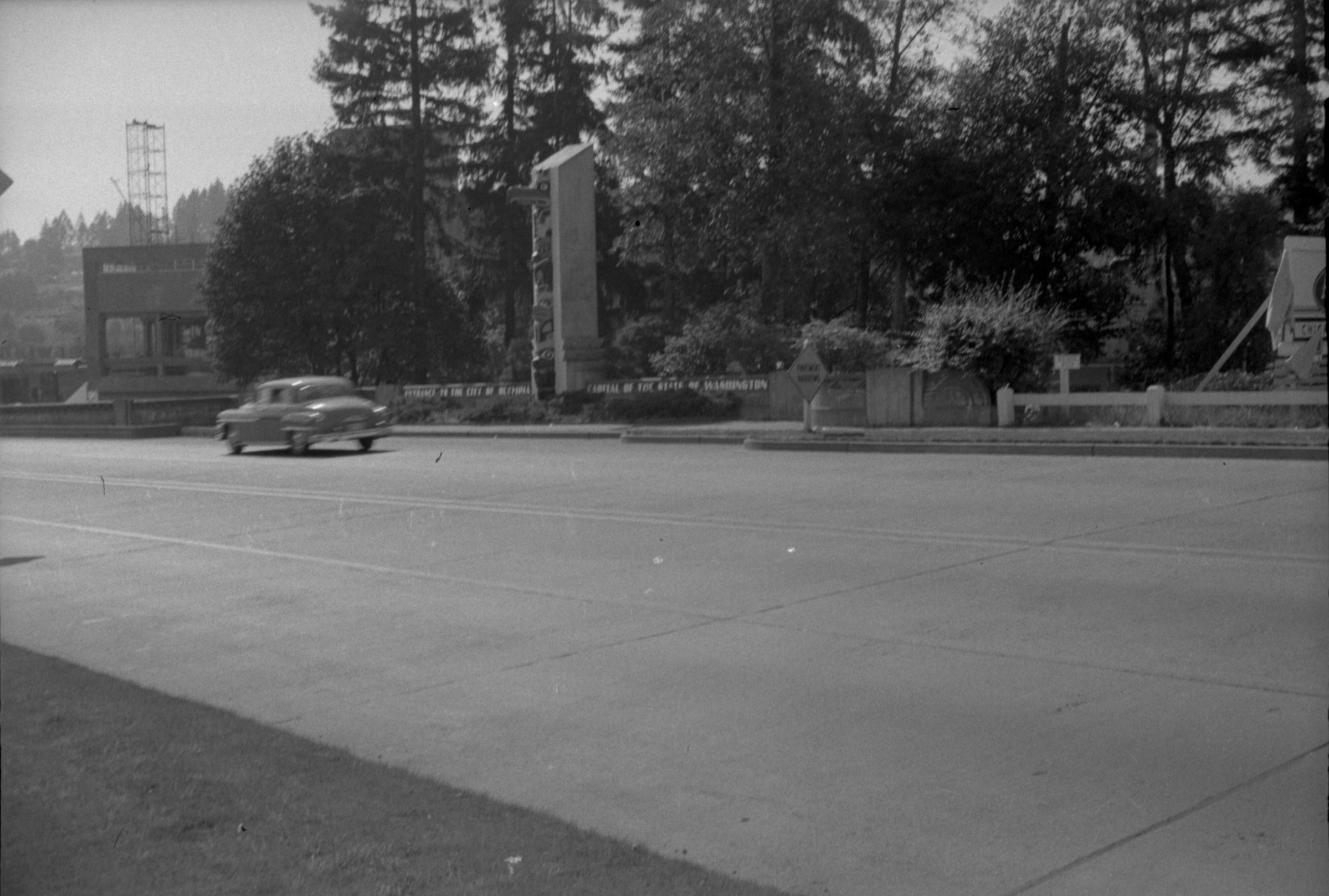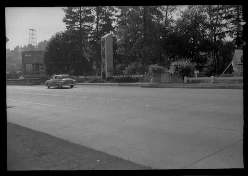 Negative, sheet film. 1 x 2 b&w. No. 744. Peter Schmidt. Carlyon Bridge with painted totem poles.