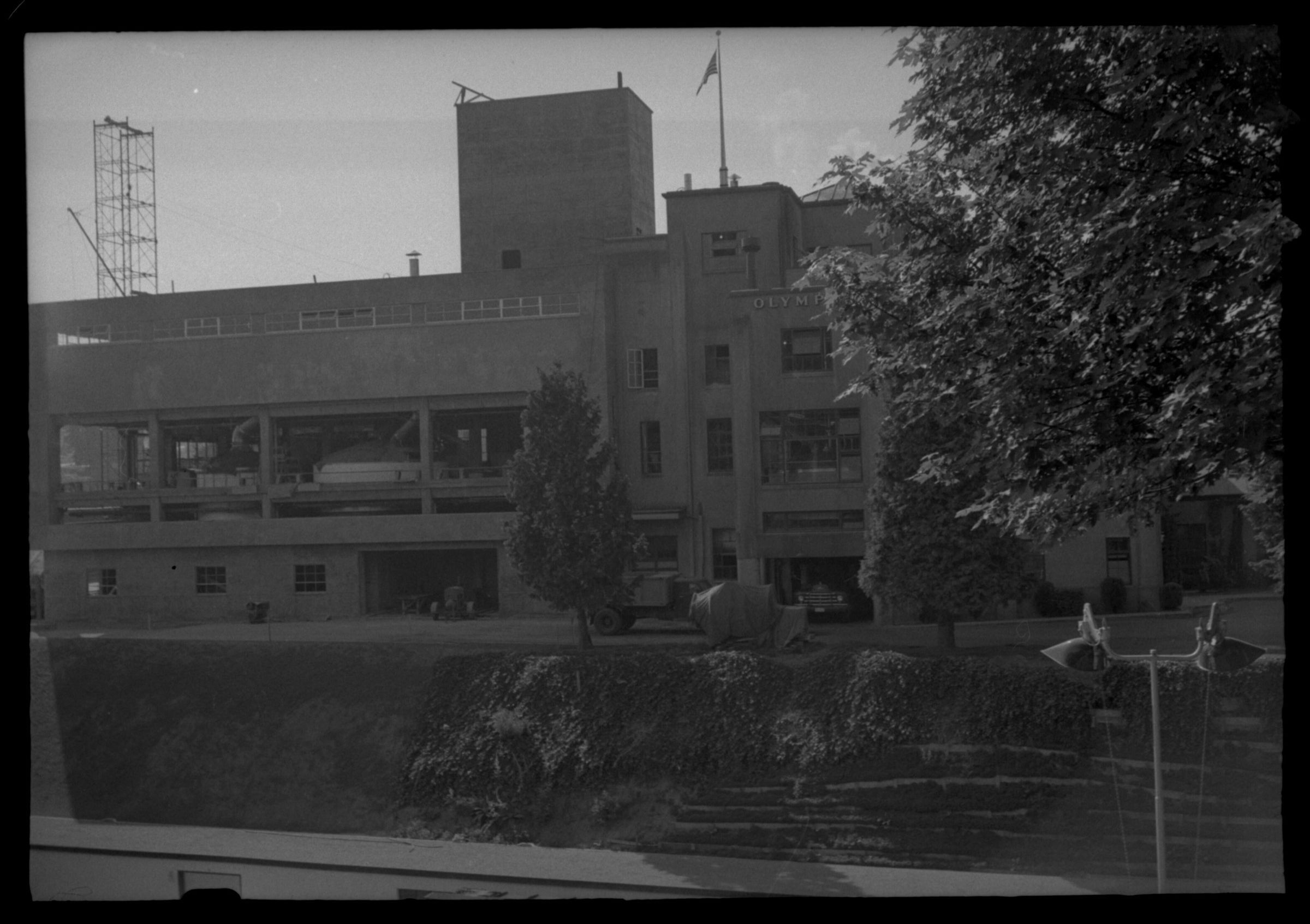 Negative, sheet film. 1 x 2 b&w. No. 744. East side of Oly brewery.