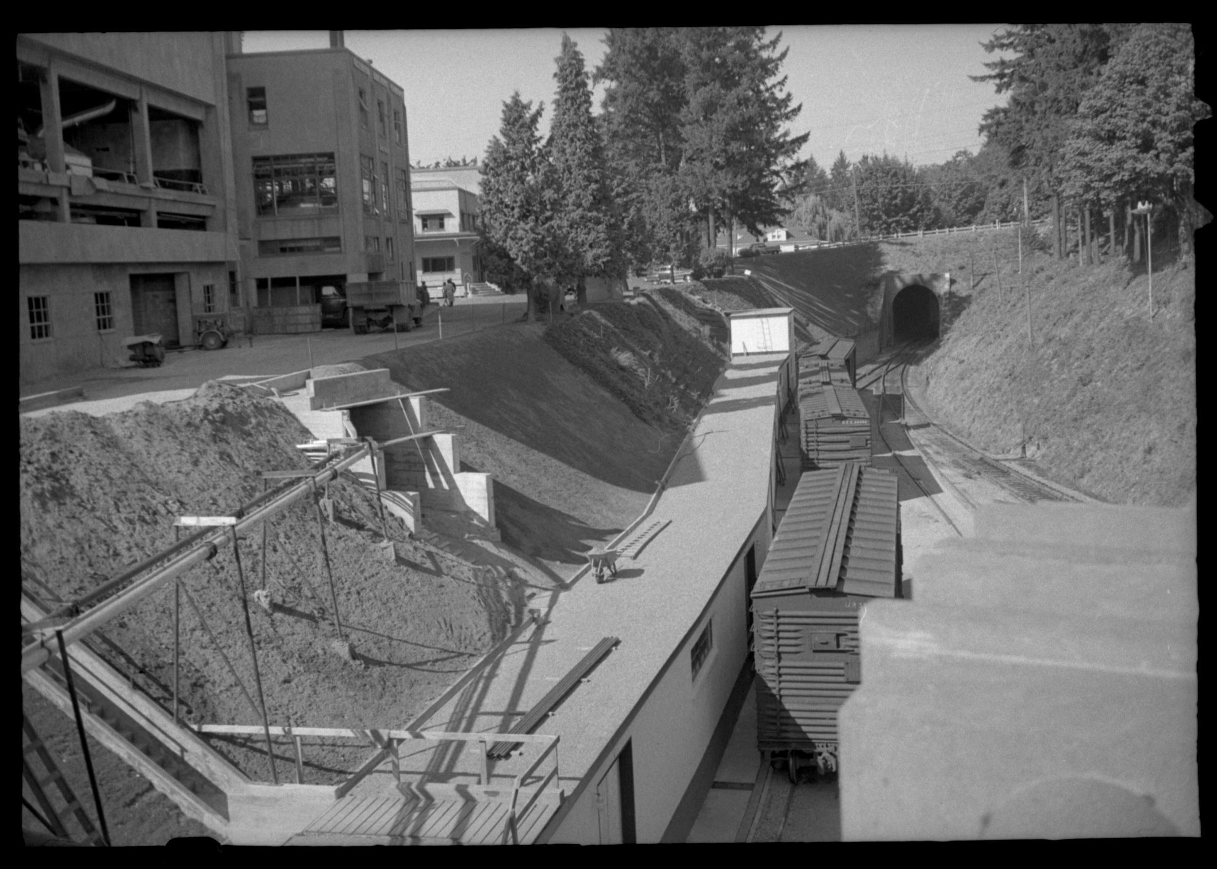 Negative, sheet film. 1 x 2 b&w. No. 744. East side of Oly brewery showing railcars and tunnel. Looking north.