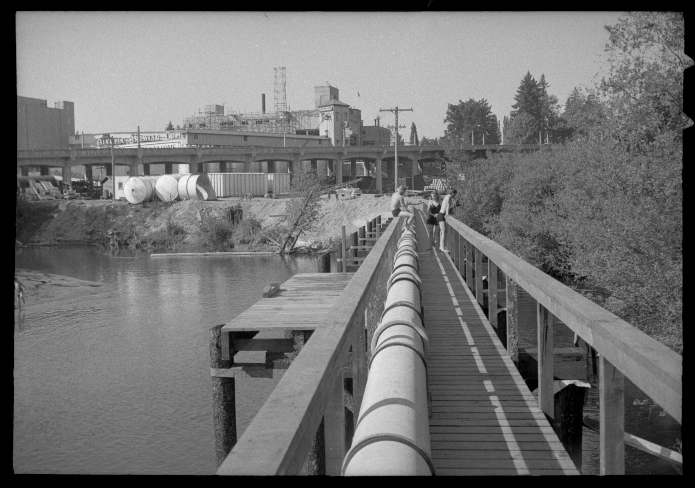 Negative, sheet film. 1 x 2 b&w. No. 744. Oly brewery looking northwest from bridge.