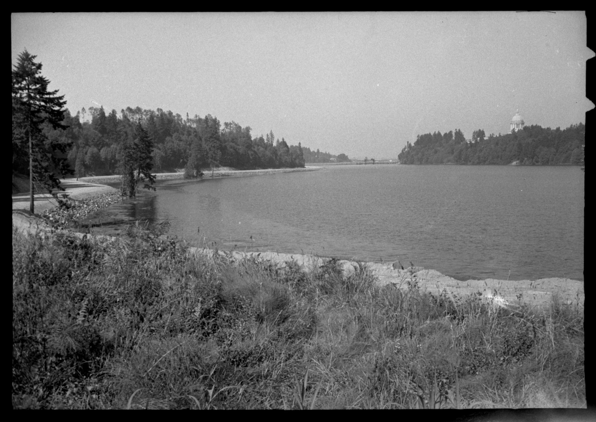 Negative, sheet film. 1 x 2 b&w. No. 744. Peter Schmidt. View of Capitol Lake/estuary, looking north from Tumwater. Capitol dome in distance.Other Names and Numbers