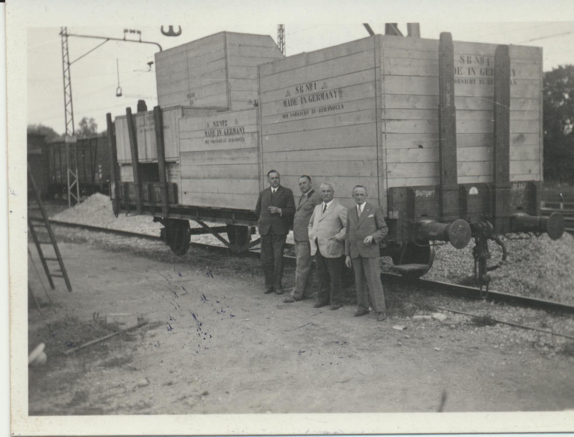 Photograph. Germany. Steinecker brewing equipment (50 barrel size) from Germany packed for shipment to Salem OR plant, 1933-34, which was being reworked for beer brewing upon repeal of Prohibition. No ID on men.
