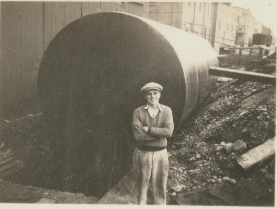 Photograph. Salem, OR. Northwest Canning Company in Salem, OR, showing tank being installed. No ID on man.