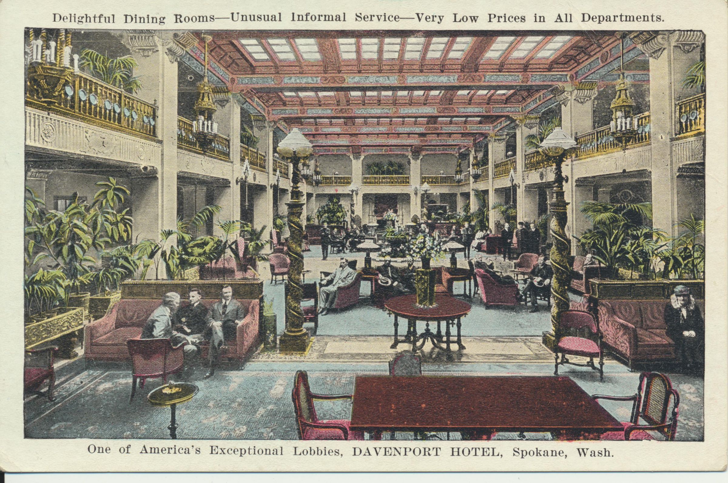 Postcard. View of lobby, Davenport Hotel, Spokane WA