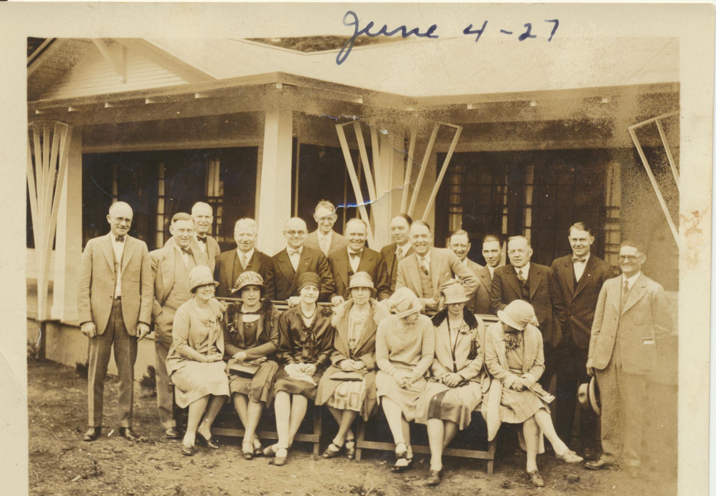 Photograph. B&W. Taken June 4, 1927. Probably a gathering of hotel personnel/board members from Western Hotels. Unknown location. Peter G. Schmidt Sr. standing at far right. Probable IDs: John Pierce, standing 3rd from left, Henry Schupp standing 4th from left.Name/Title