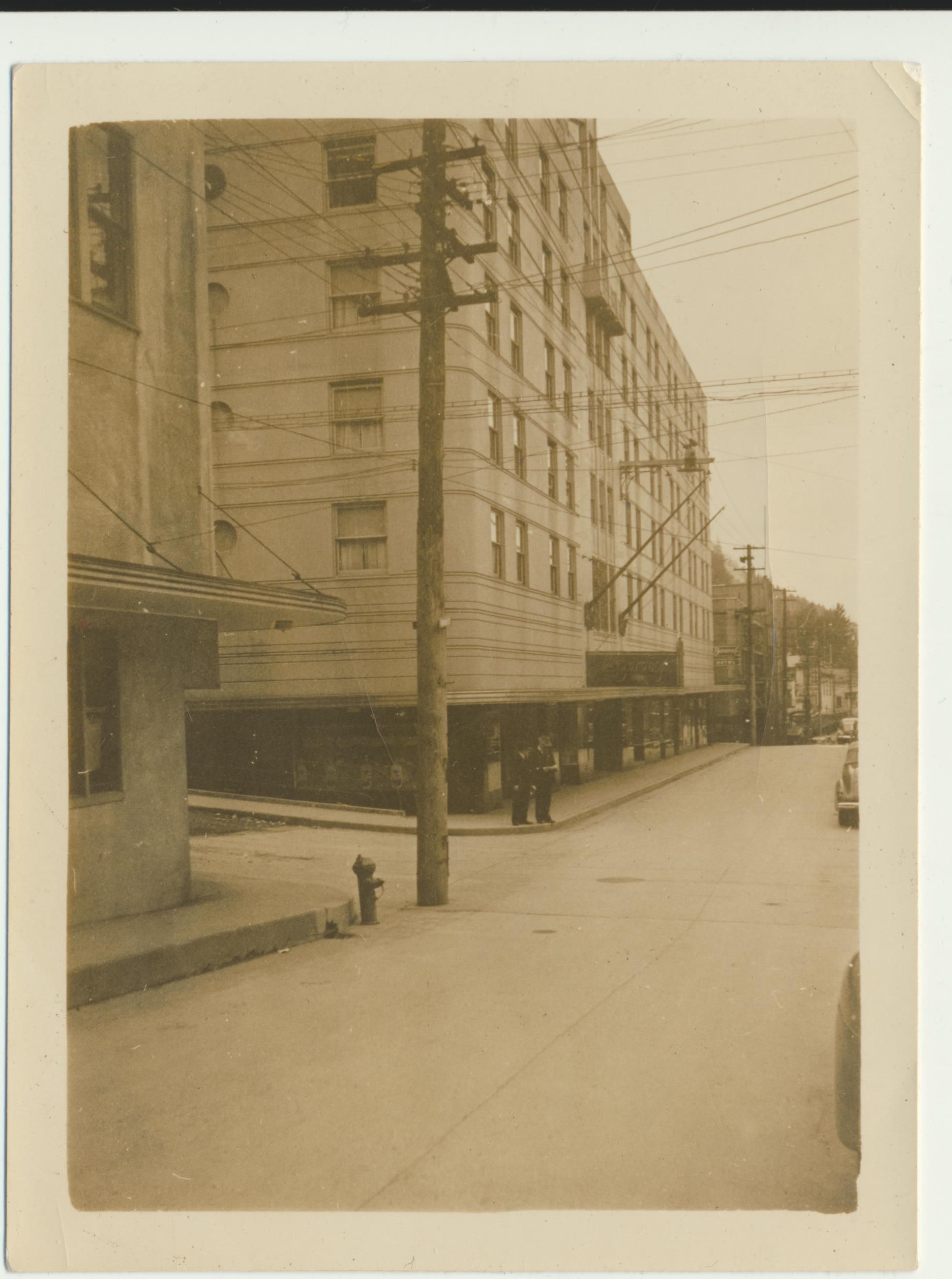 Photograph. B&W. View of Hotel Baranof, Juneau AK. Hotel was built in 1939.