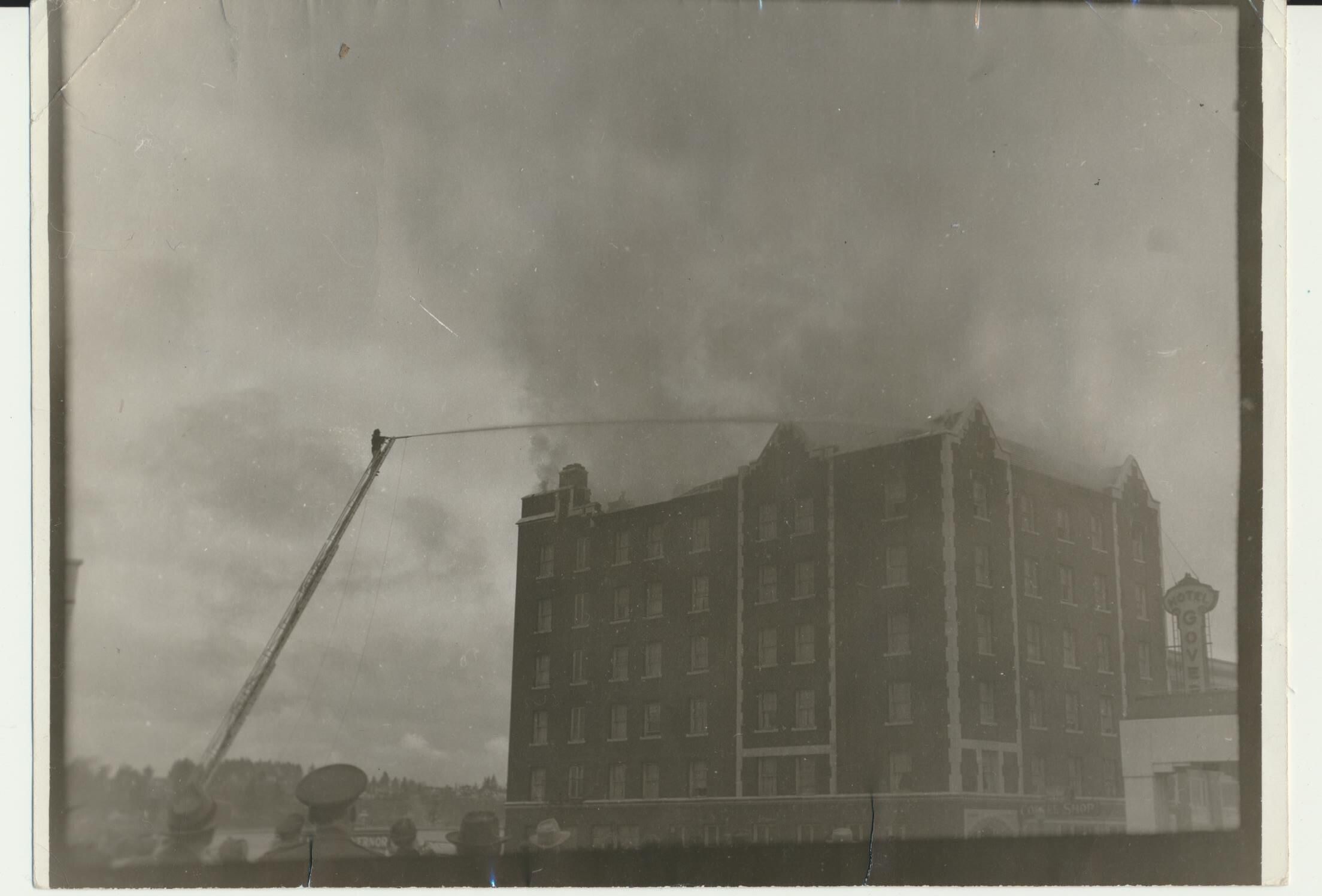 Photograph. B&W. View of Governor Hotel, Olympia WA. Fighting fire on roof of hotel, April 9, 1943. Hotel was built in 1928 as a 7-story brick building, replacing a 3-story structure built in 1890.Name/Title