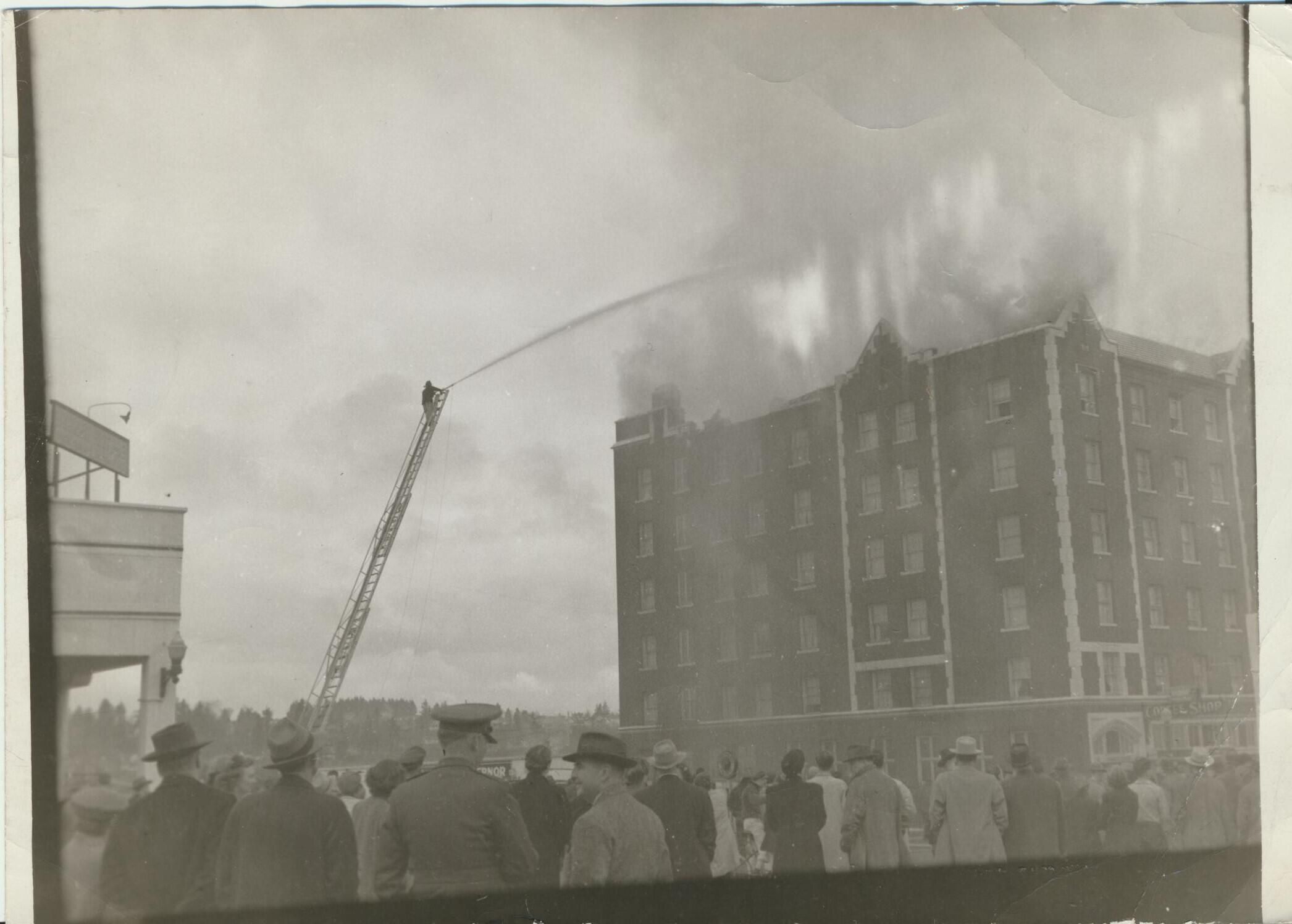 Photograph. B&W. View of Governor Hotel, Olympia WA. Fighting fire on roof of hotel, April 9, 1943. Hotel was built in 1928 as a 7-story brick building, replacing a 3-story structure built in 1890.Name/Title