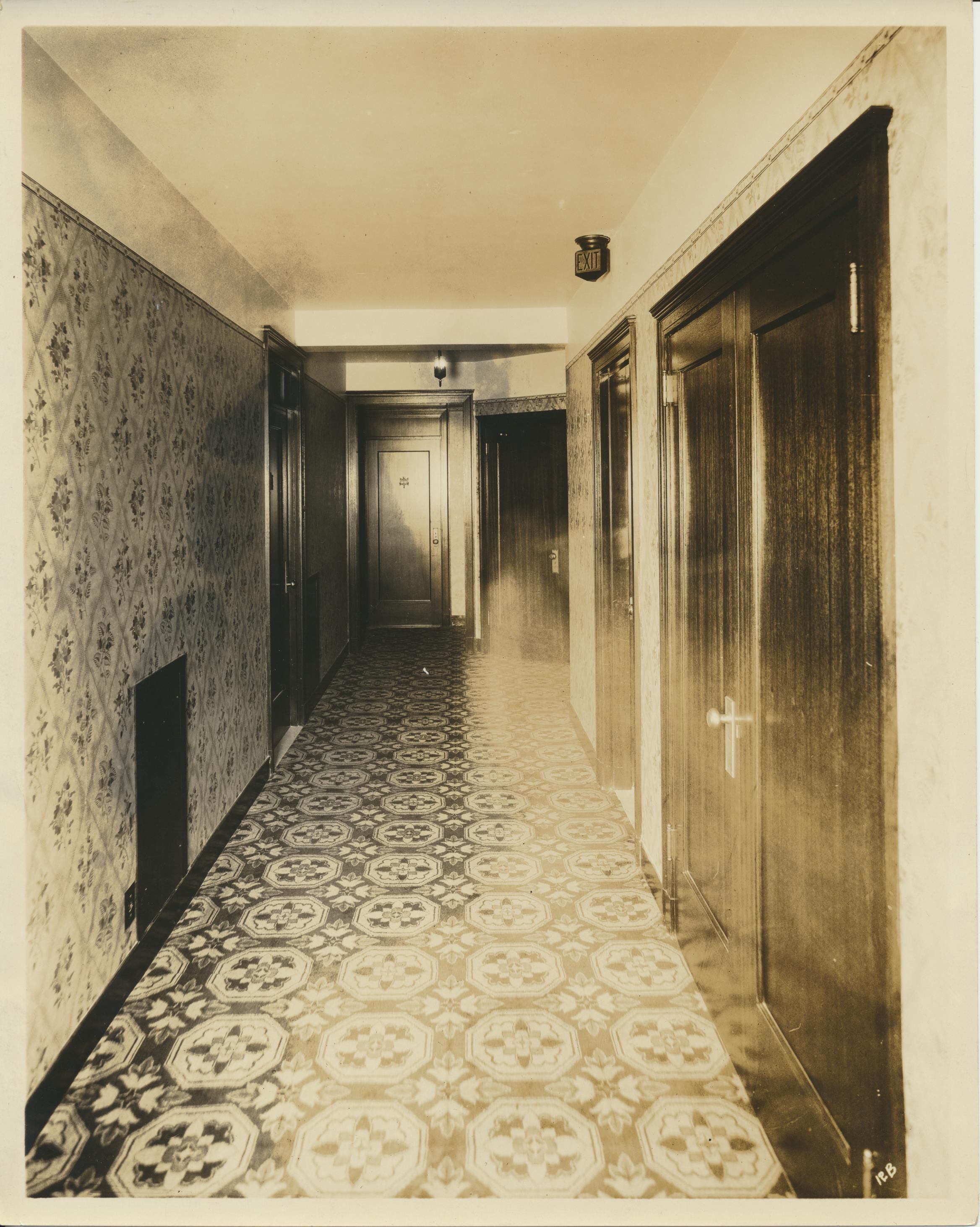 Photograph. Hallway in unknown hotel, unknown city.
