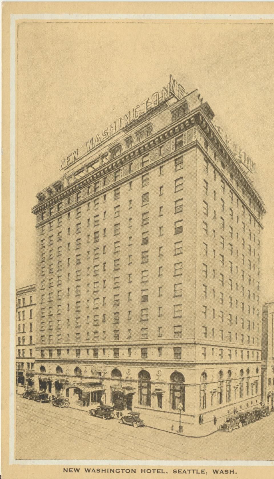 Postcard, picture. View of New Washington Hotel, Seattle WA. Hotel owned by Schmidts, managed by Adolph Schmidt Sr.