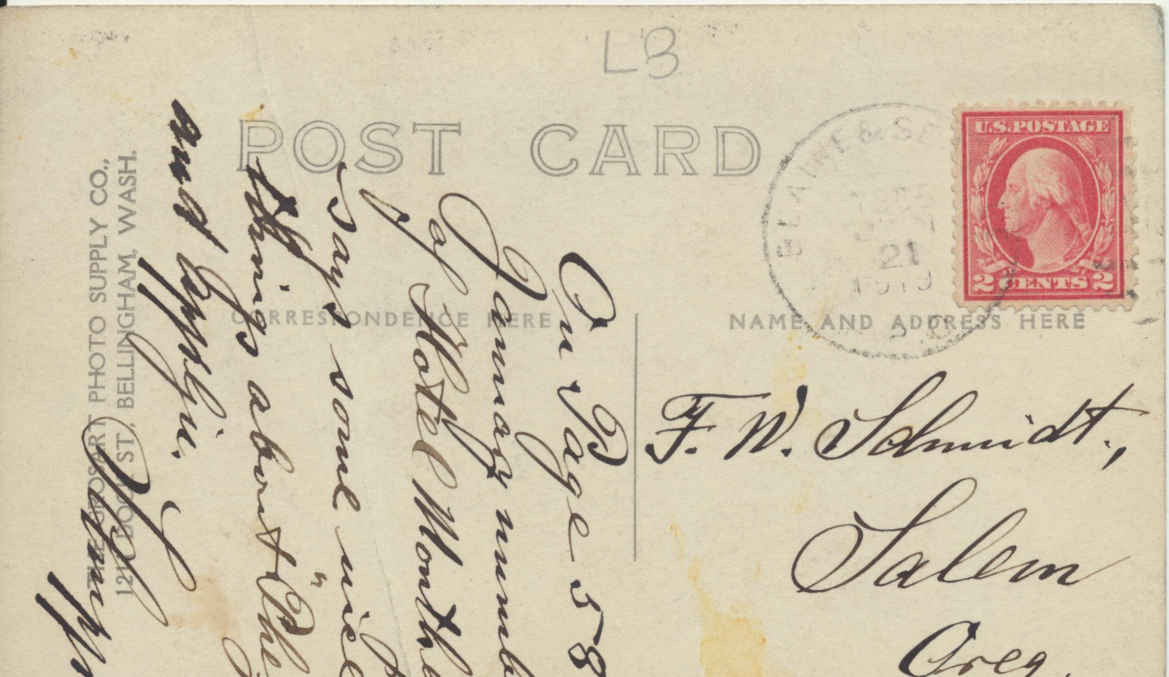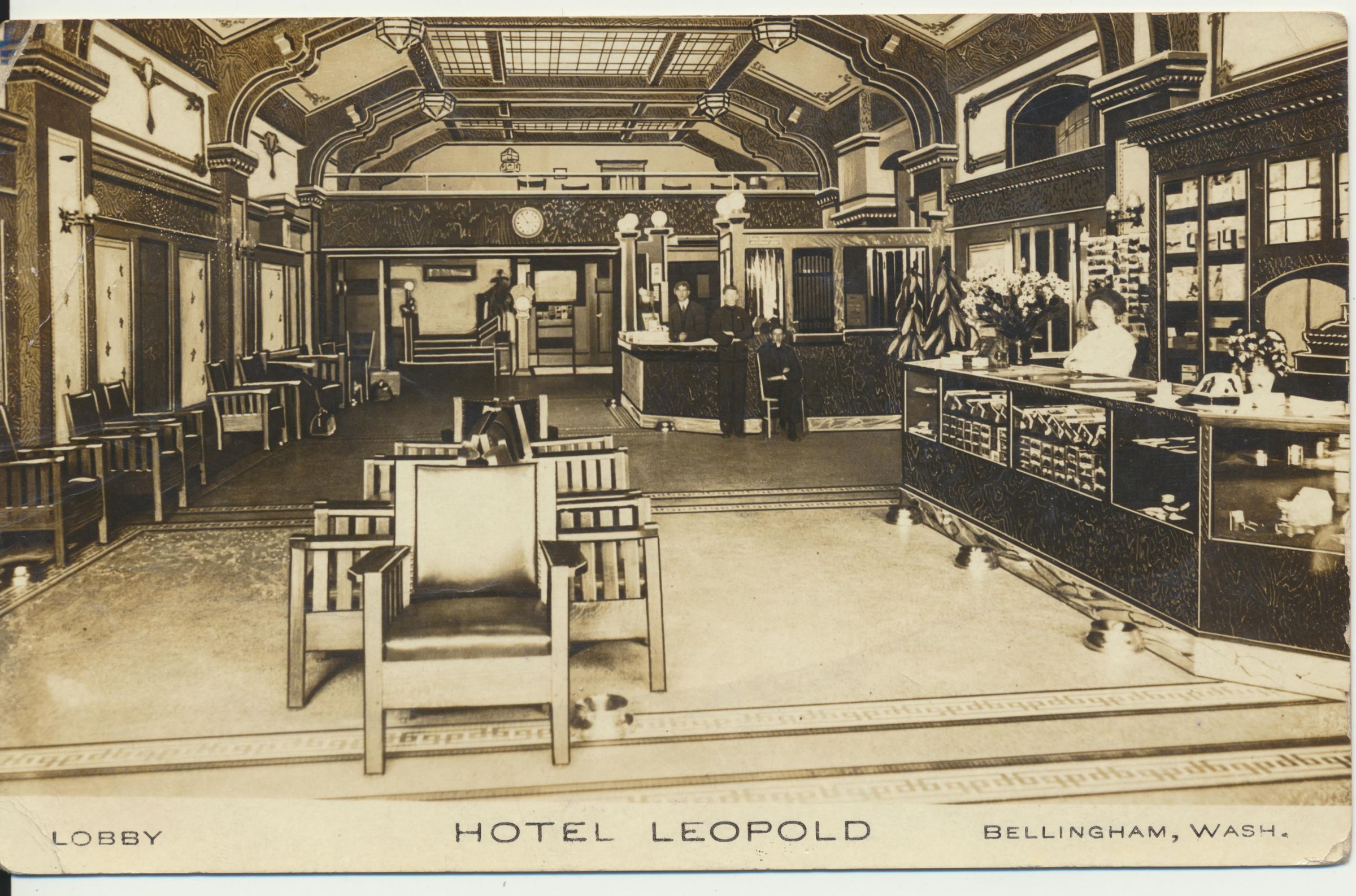 Postcard, picture. View of lobby of Hotel Leopold, Bellingham WA. Card sent by Henry Schupp, manager, to F. Schmidt, Salem OR.