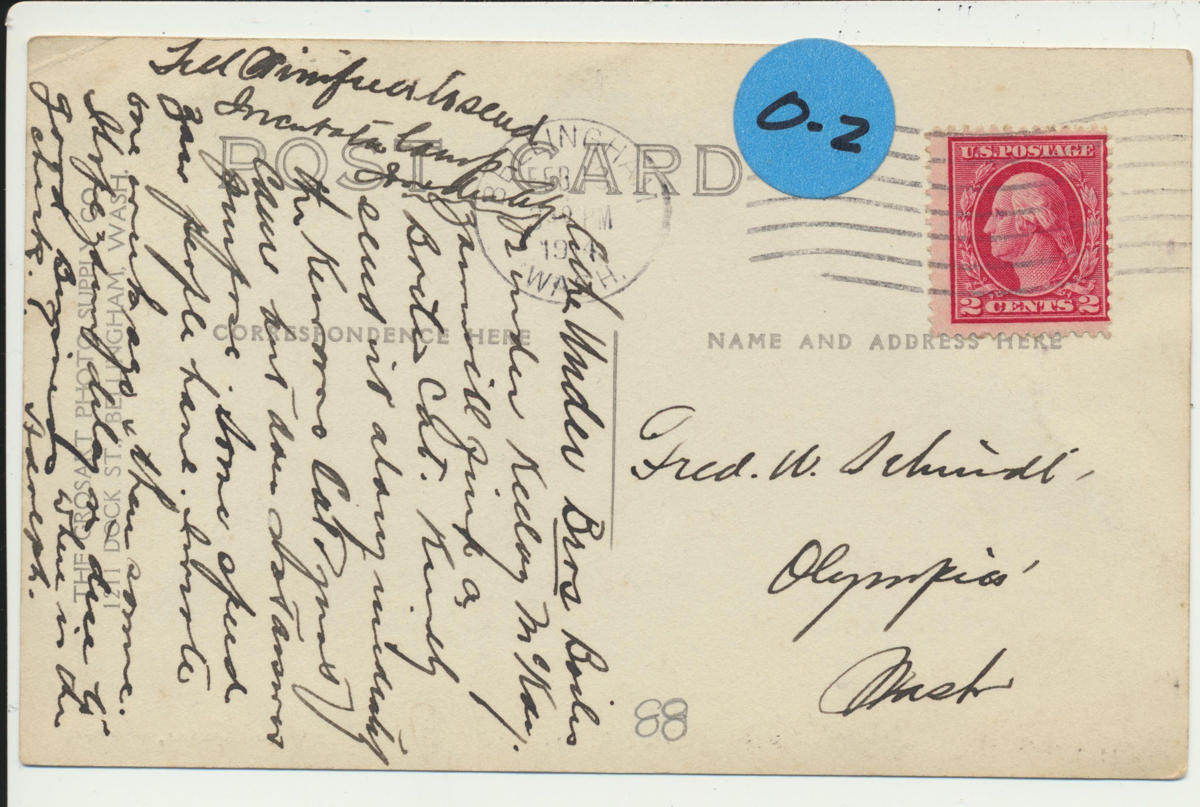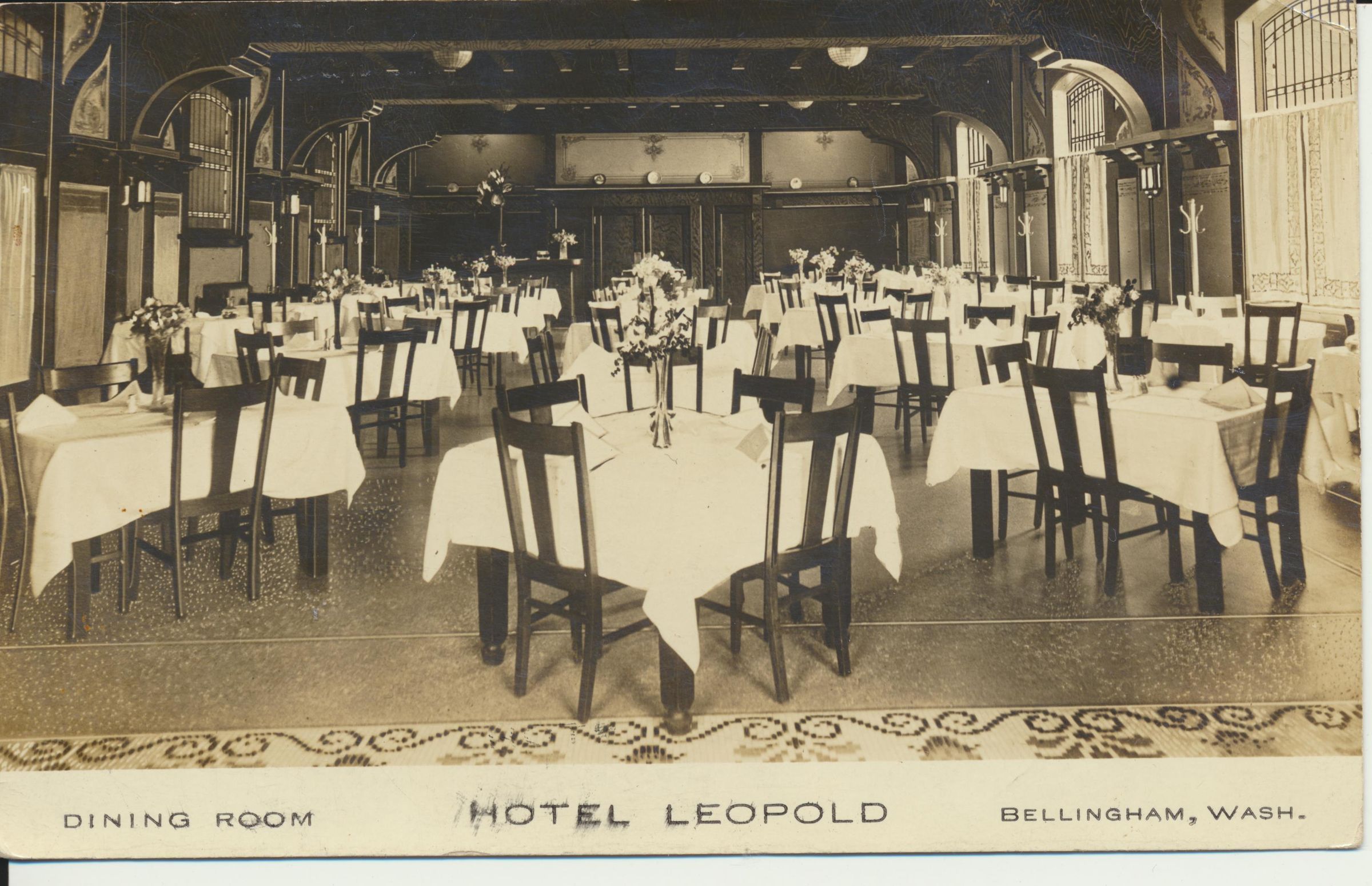 Postcard, picture. View of dining room of Hotel Leopold, Bellingham WA. Card sent by Henry Schupp, manager, to Fred Schmidt, Olympia WA