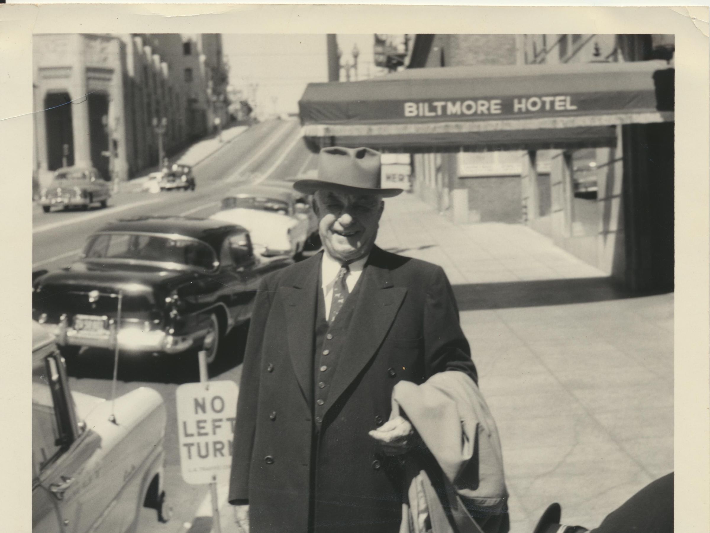 Photograph. Street scene by Biltmore Hotel in unknown city. No ID on man.