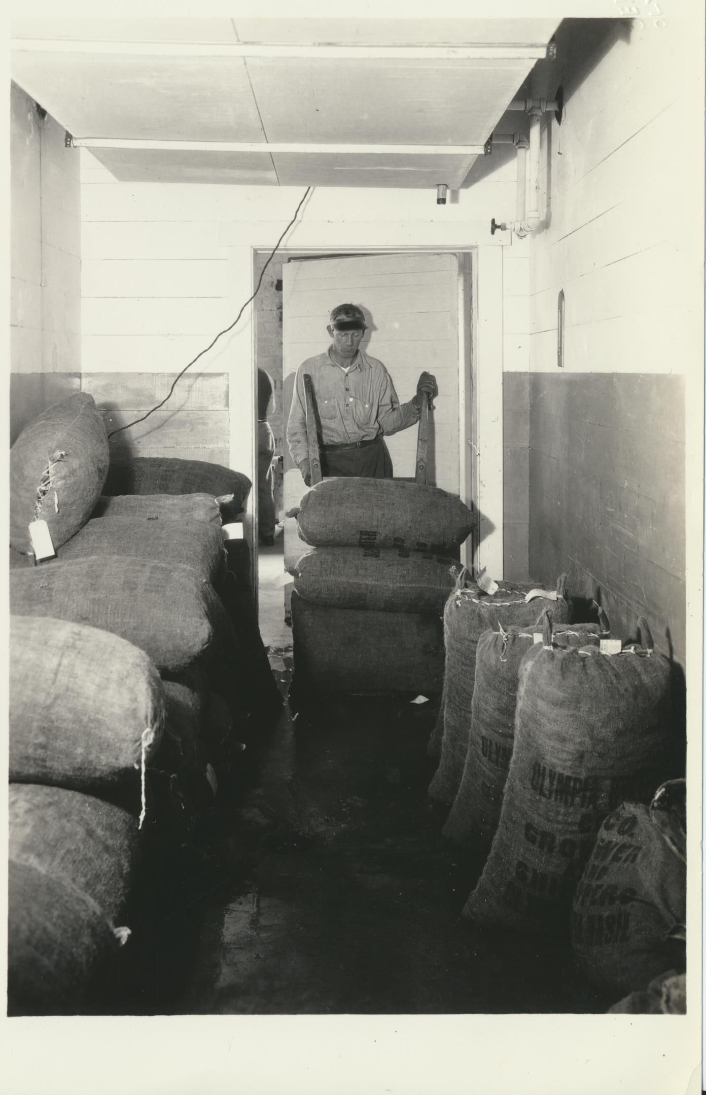 Photograph. Man loading gunny sacks of unknown material. Sacks stenciled "Olympia Beer Co. Growers and Shippers Olympia Wash"